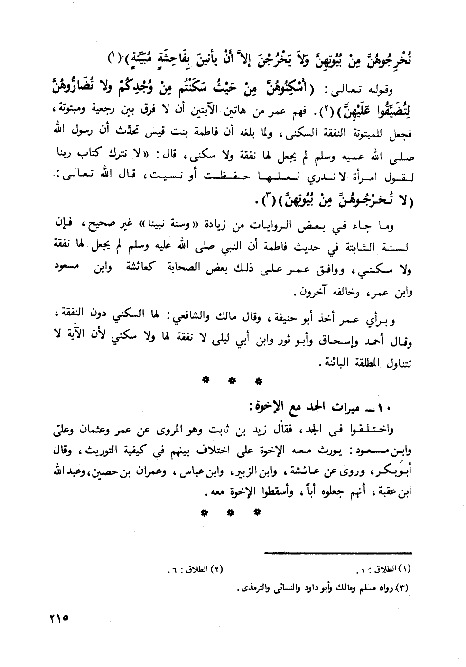 وقوله تعالى: {أَسْكِنُوهُنَّ مِنْ حَيْثُ سَكَنْتُمْ مِنْ وُجْدِكُمْ وَلا تُضَارُّوهُنَّ لِتُضَيِّقُوا عَلَيْهِنّ} 2. فهم عمر من هاتين الآيتين أن لا فرق بين رجعية ومبتوتة، فجعل للمبتوتة النفقة السكنى، ولما بلغه أن فاطمة بنت قيس تحدث أن رسول الله صلى الله عليه وسلم لم يجعل لها نفقة ولا سكنى، قال: "لا نترك كتاب ربنا لقول امرأة لا ندري لعلها حفظت أو نسيت، قال الله تعالى: {لا تُخْرِجُوهُنَّ مِنْ بُيُوتِهِن} 3.