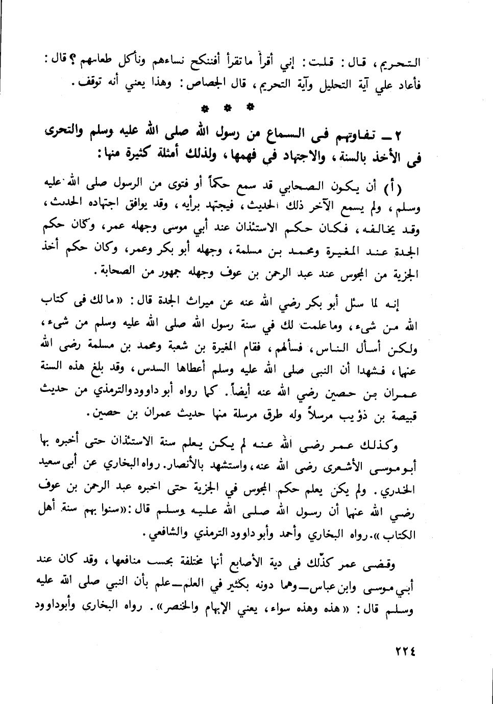 2- تفاوتهم في السماع من رسول الله صلى الله عليه وسلم والتحري في الأخذ بالسنة، والاجتهاد في فهمها، ولذل أمثلة كثيرة منها: