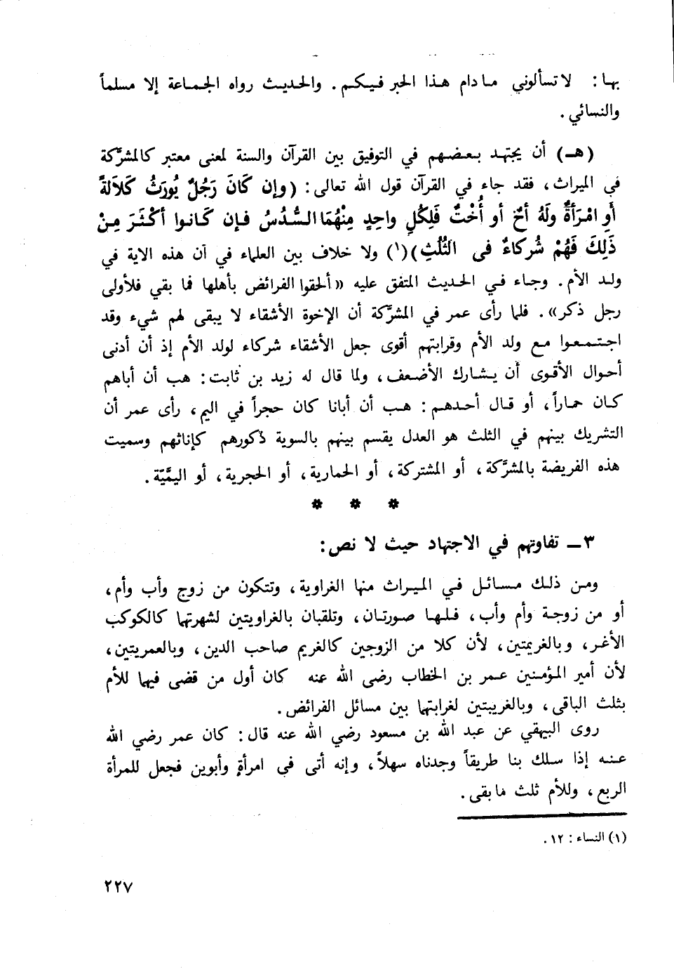 هـ- أن يجتهد بعضهم في التوفيق بين القرآن والسنة لمعنى معتبر كالمشركة في الميراث فقد جاء في القرآن قول الله تعالى: {وَإِنْ كَانَ رَجُلٌ يُورَثُ كَلالَةً أَوِ امْرَأَةٌ وَلَهُ أَخٌ أَوْ أُخْتٌ فَلِكُلِّ وَاحِدٍ مِنْهُمَا السُّدُسُ فَإِنْ كَانُوا أَكْثَرَ مِنْ ذَلِكَ فَهُمْ شُرَكَاءُ فِي الثُّلُثِ} 1 ولا خلاف بين العلماء في أن هذه الآية في ولد الأم. وجاء في الحديث المتفق عليه "ألحقوا الفرائض بأهلها فما بقي فللأولى رجل ذكر"؛ فلما رأى عمر في المشركة أن الإخوة الأشقاء لا يبقى لهم شيء وقد اجتمعوا مع ولد الأم وقرابتهم أقوى جعل الأشقاء شركاء لولد الأم؛ إذ إن أدنى أحوال الأقوى أن يشارك الأضعف، ولما قال له زيد بن ثابت: هب أن أباهم كان حمارا، أو قال أحدهم: هب أن أبانا كان حجرا في اليم، رأي عمر أن التشريك بينهم في الثلث هو العدل يقسم بينهم بالسوية ذكورهم كإناثهم وسميت هذه الفريضة بالمشركة، أو المشتركة، أو الحمارية، أو الحجرية، أو اليمية.