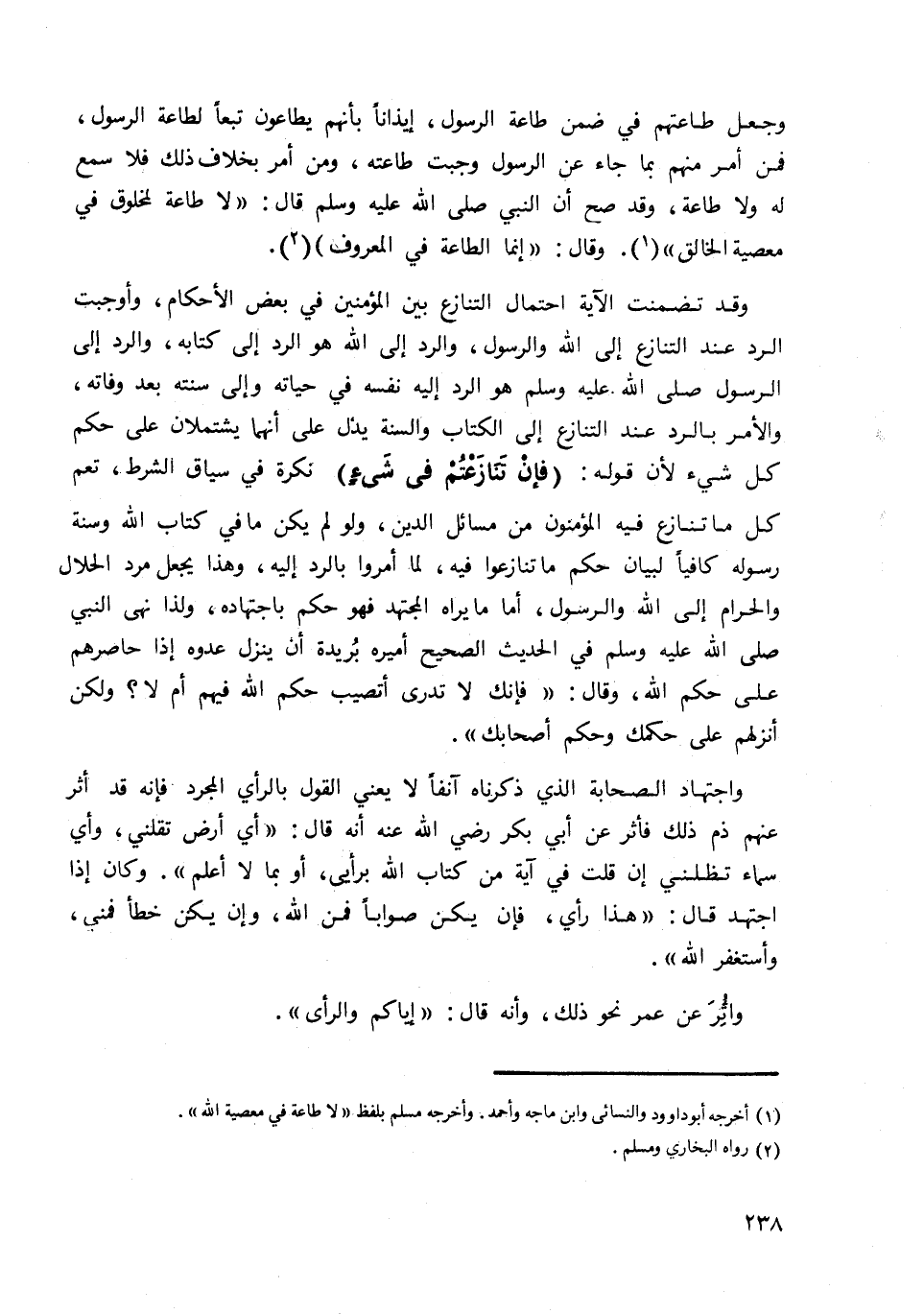 وقد تضمنت الآية احتمال التنازع بين المؤمنين في بعض الأحكام وأوجبت الرد عند التنازع إلى الله والرسول، والرد إلى الله هو الرد إلى كتابه، والرد إلى الرسول صلى الله عليه وسلم هو الرد إليه نفسه في حياته وإلى سنته بعد وفاته، والأمر بالرد عند التنازع إلى الكتاب والسنة يدل على أنهما يشتملان على حكم كل شيء لأن قوله: {فَإِنْ تَنَازَعْتُمْ فِي شَيْءٍ} نكرة في سياق الشرط تعم كل ما تنازع فيه المؤمنون من مسائل الدين، ولو لم يكن ما في كتاب الله وسنة رسوله كافيا لبيان حكم ما تنازعوا فيه، لما أمروا بالرد إليه، وهذا يجعل مرد الحلال والحرام إلى الله والرسول، أما ما يراه المجتهد فهو حكم باجتهاده، ولذا نهى النبي صلى الله عليه وسلم في الحديث الصحيح أميره بريدة أن ينزل عدوه إذا حاصرهم على حكم الله، وقال: "فإنك لا تدري أتصيب حكم الله فيهم أم لا؟ ولكن أنزلهم على حكمك وحكم أصحابك".