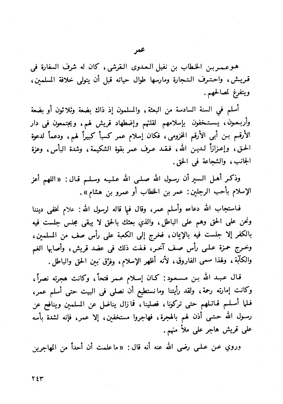 قال عبد الله بن مسعود: كان إسلام عمر فتحا، وكانت هجرته نصرا، وكانت إمارته رحمة، ولقد رأيتنا وما نستطيع أن نصلي في البيت حتى أسلم عمر؛ فلما أسلم قاتلهم حتى تركونا، فصلينا، فما زال يناضل عن المسلمين، وينافح عن رسول الله حتى أذن لهم بالهجرة، فهاجروا مستخفين، إلا عمر، فإنه لشدة بأسه على قريش هاجر على ملأ منهم.