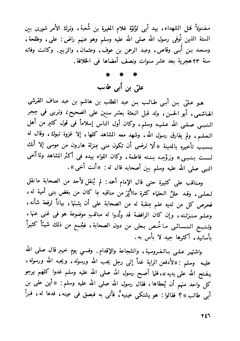 ومناقب على كثيرة حتى قال الإمام أحمد: لم ينقل لأحد من الصحابة ما نقل لعلي، وقد علل العلماء كثرة ما أثر من مناقبه بما كان من بغض بني أمية له؛ فحرص كل من لديه علم بمنقبه له من الصحابة على أن يثبتها، بيانا لرفعة شأنه، وعلو منزلته، وإن كان الرافضة قد ولدوا له مناقب موضوعة هو في غنى عنها، وتتبع النسائي ما خص بعلي من دون الصحابة؛ فجمع من ذلك شيئا كثيرا بأسانيد، أكثرها جيد لا بأس به.