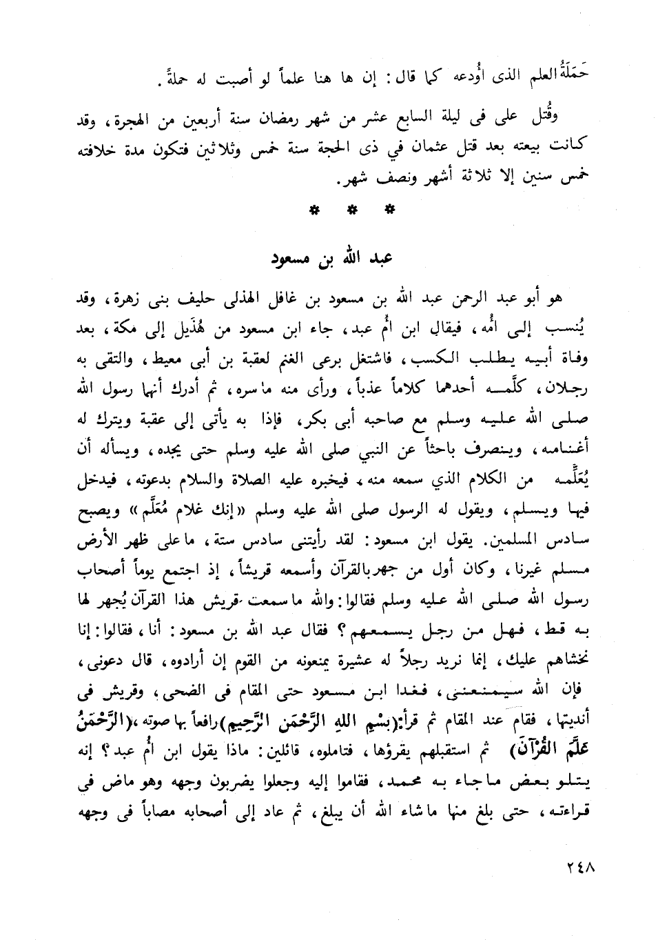 هو أبو عبد الرحمن عبد الله بن مسعود بن غافل الهذلي حليف بني زهرة، وقد ينسب إلى أمه؛ فيقال ابن أم عبد، جاء ابن مسعود من هذيل إلى مكة، بعد وفاة أبيه يطلب الكسب، فاشتغل برعي الغنم لعقبة بن أبي معيط، والتقى به رجلان، كلمه أحدهما كلاما عذبا، ورأى منه ما سره، ثم أدرك أنهما رسول الله صلى الله عليه وسلم مع صاحبه أبي بكر؛ فإذا به يأتي إلى عقبة ويترك له أغنامه، وينصرف باحثا عن النبي صلى الله عليه وسلم حتى يجده، ويسأله أن يعلمه من الكلام الذي سمعه منه فيخبره عليه الصلاة والسلام بدعوته؛ فيدخل فيها ويسلم، ويقول له الرسول صلى الله عليه وسلم "إنك غلام معلم" ويصبح سادس المسلمين، يقول ابن مسعود: لقد رأيتني سادس ستة، ما على ظهر الأرض مسلم غيرنا، وكان أول من جهر بالقرآن وأسمعه قريشا، إذا اجتمع يومًا أصحاب رسول الله صلى الله عليه وسلم فقالوا: والله ما سمعت قريش هذا القرآن يجهر لها به قط، فهل من رجل يسمعهم؟ فقال عبد الله بن مسعود: أنا؛ فقالوا: إنا نخشاهم عليك، إنما نريد رجلا له عشيرة يمنعونه من القوم إن أرادوه، قال دعوني، فإن الله سيمنعني، فإذا ابن مسعود حتى المقام في الضحى، وقريش في أنديتها؛ فقام عند المقام ثم قرأ: {بِسْمِ اللَّهِ الرَّحْمَنِ الرَّحِيم} رافعا بها صوته، {الرَّحْمَنُ، عَلَّمَ الْقُرْآنَ} ثم استقبلهم يقرؤها، فتأملوه قائلين: ماذا يقول ابن أم عبد؟ إنه يتلو بعض ما جاء به محمد، فقاموا إليه وجعلوا يضربون وجهه وهو ماض في قراءته، حتى بلغ منها ما شاء الله أن يبلغ، ثم عاد إلى أصحابه مصابا في وجهه.