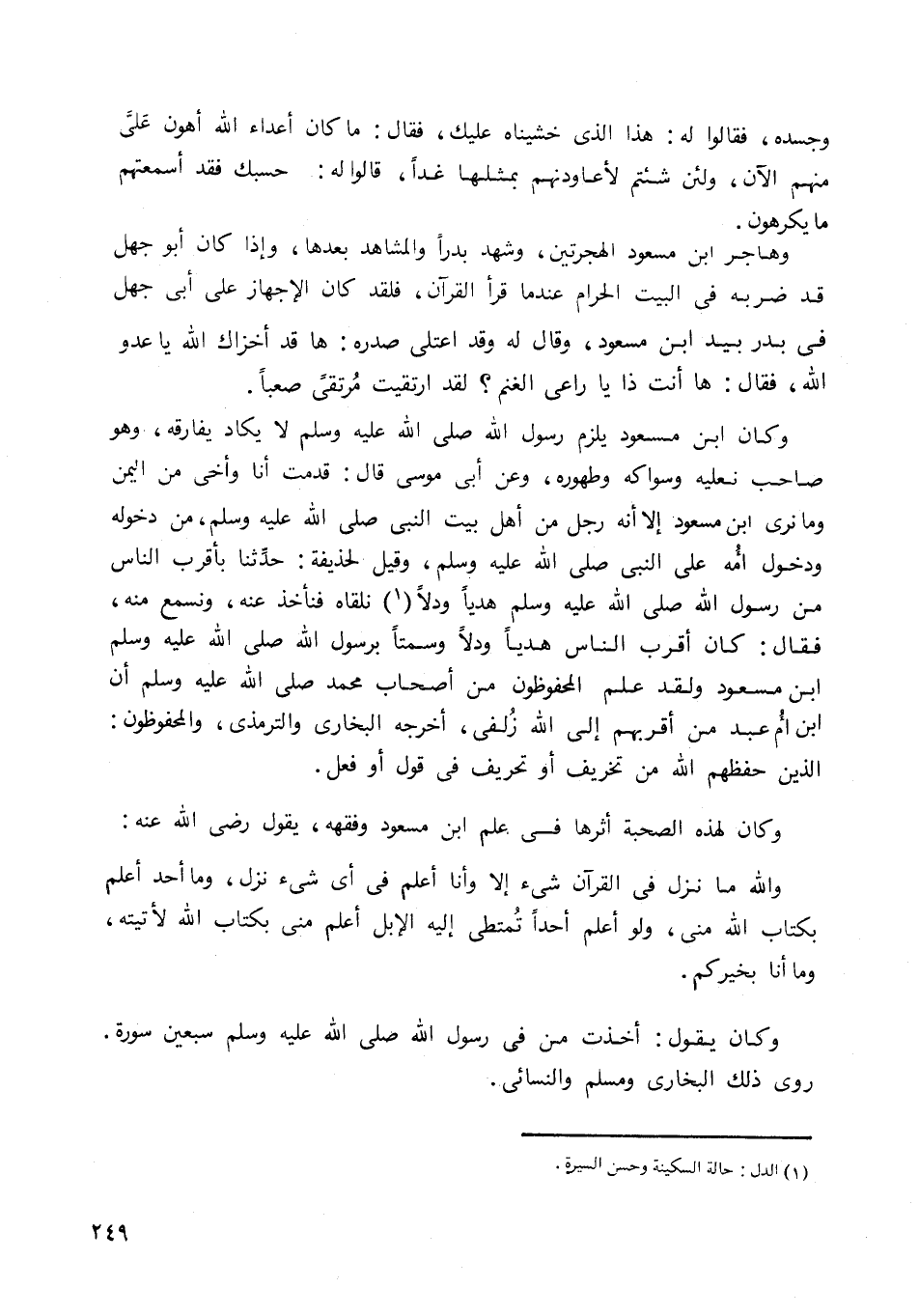 وهاجر ابن مسعود الهجرتين، وشهد بدرا والمشاهد بعدها، وإذا كان أبو جهل قد ضربه في البيت الحرام عندما قرآن القرآن؛ فلقد كان الإجهاز على أبي جهل في بدر بيد ابن مسعود، وقال له وقد أعلى صدره، ها قد أخزاك الله يا عدو الله، فقال: ها أنت ذا يا راعي الغنم؟ لقد ارتقيت مرتقى صعبا.