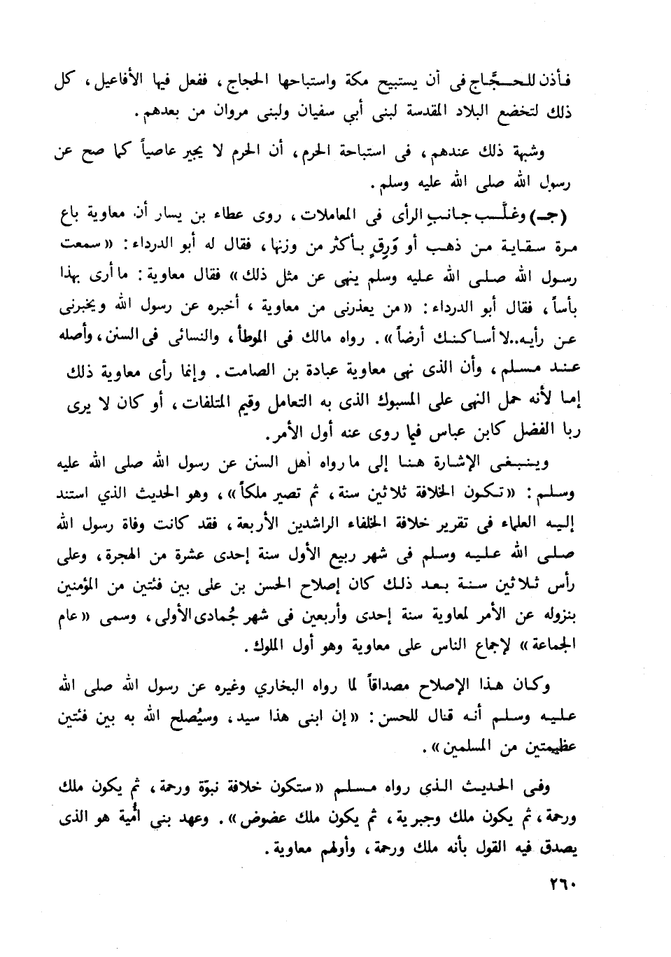 وينبغي الإشارة هنا إلى ما رواه أهل السنن عن رسول الله صلى الله عليه وسلم: "يكون الخلافة ثلاثين سنة، ثم تصير ملكا". وهو الحديث الذي استند إليه العلماء في تقرير خلاة الخلفاء الراشدين الأربعة؛ فقد كانت وفاة رسول الله صلى الله عليه وسلم في شهر ربيع الأول سنة إحدى عشرة من الهجرة، وعلى رأس ثلاثين سنة بعد ذلك كان إصلاح الحسن بن على بين فئتين من المؤمنين بنزوله عن الأمر لمعاوية سنة إحدى وأربعين في شهر جمادي الأولى، وسمي "عام الجماعة" لإجماع الناس على معاوية وهو أول الملوك.