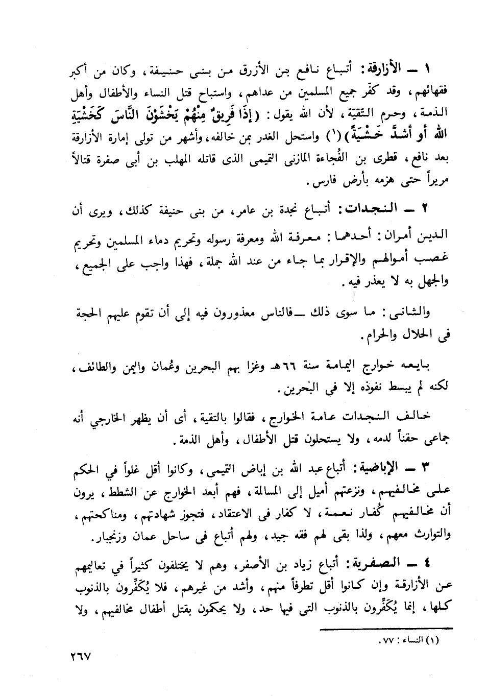1- الأزارقة: أتباع نافع بن الأزرق من بني حنيفة، وكان من أكبر فقهائهم، وقد كفر جمع المسلمين من عداهم، واستباح قتل النساء والأطفال وأهل الذمة، وحرم التقية؛ لأن الله يقول: {إِذَا فَرِيقٌ مِنْهُمْ يَخْشَوْنَ النَّاسَ كَخَشْيَةِ اللَّهِ أَوْ أَشَدَّ خَشْيَةً} 1 واستحل الغدر بمن خالفه، وأشهر من تولي إمارة الأزارقة بعد نافع، قطري بن الفجاءة المازني التميمي الذي قاتله المهلب بن أبي صفرة قتالا مريرا حتى هزمه بأرض فارس.