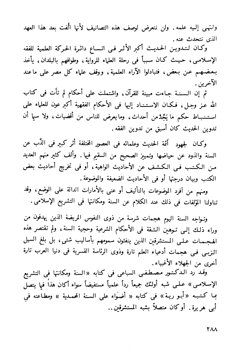 وقد ورد الدكتور مصطفى السباعي في كتابه "السنة ومكانتها في التشريع الإسلامي" على شبه أولئك جميعا ردا علميا مستفيضا سواء أكان هذا فيما يتصل بما كتبه "أبو رية" في كتابه "أضواء على السنة المحمدية" ومطاعنه في أبي هريرة. أو كان متصلا بشبه المستشرقين ...