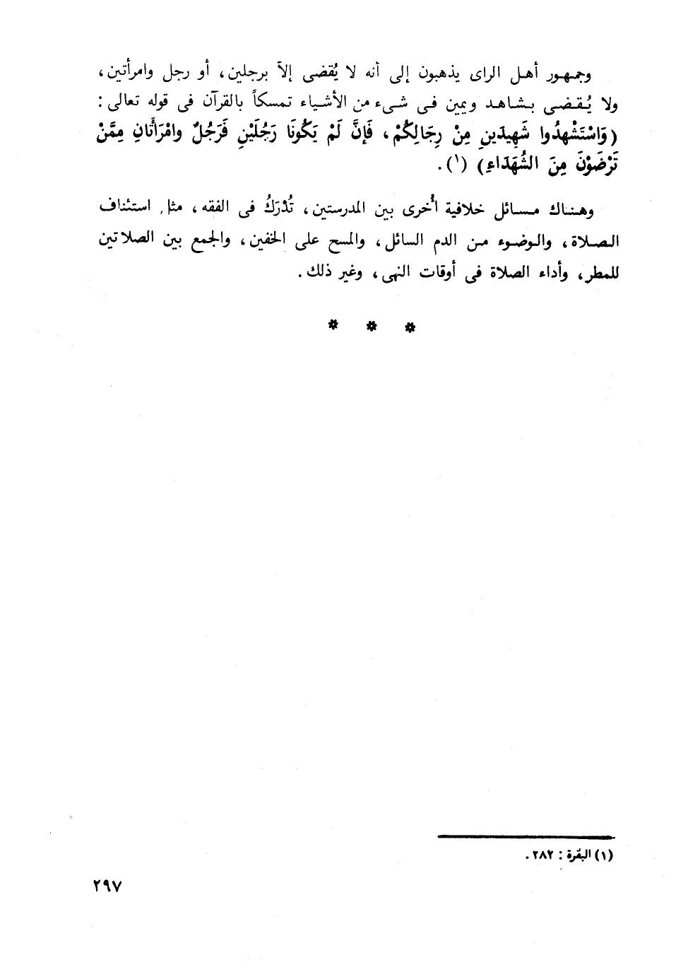 وجمهور أهل الرأي يذهبون إلى أنه لا يقضي إلا برجلين، أو رجل وامرأتين، ولا يقضي بشاهد ويمين في شيء من الأشياء تمسكا بالقرآن في قوله تعالى: {وَاسْتَشْهِدُوا شَهِيدَيْنِ مِنْ رِجَالِكُمْ فَإِنْ لَمْ يَكُونَا رَجُلَيْنِ فَرَجُلٌ وَامْرَأَتَانِ مِمَّنْ تَرْضَوْنَ مِنَ الشُّهَدَاءِ} 1.