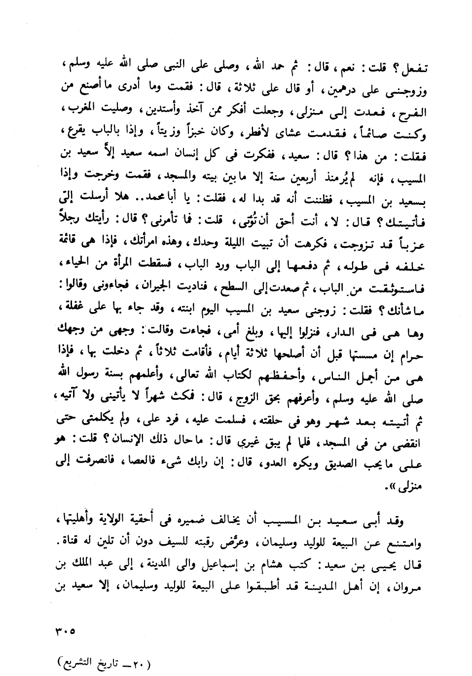 تفعل؟ قلت: نعم، قال: ثم حمد الله، وصلى على النبي صلى الله عليه وسلم، وزوجني على درهمين، أو قال على ثلاثة، قال: فقمت وما أدري ما أصنع من الفرح، فعدت إلى منزلي، وجعلت أفكر ممن آخذ وأستدين، وصليت المغرب، وكنت صائما؛ فقدمت عشاي لأفطر، وكان خبزا وزيتا، وإذا بالباب يقرع، فقلت: من هذا؟ قال: سعيد؛ ففكرت في كل إنسان اسمه سعيد إلا سعيد بن المسيب؛ فإنه لم يرمنذ أربعين سنة إلا ما بين بيته والمسجد، فقمت وخرجت وإذا بسعيد بن المسيب، فظننت أنه قد بدا له، فقلت: يا أبا محمد ... هلا أرسلت إلى فأتيتك؟ قال: لا، أنت أحق أن تؤتى، قلت: فما تأمرني؟ قال: رأيتك رجلا عزبا قد تزوجت، فكرهت أن تبيت الله وحدك، وهذه امرأتك؛ فإذا هي قائمة خلفه في طوله، ثم دفعها إلى الباب ورد الباب، فسقطت المرأة من الحياء، فاستوثقت من الباب، ثم صعدت إلى السطح، فناديت الجيران، فجاءوني وقالوا: ما شأنك؟ فقلت: زوجني سعيد بن المسيب اليوم ابنته، وقد جاء بها على غفلة، وها هي في الدار، فنزلوا إليها، وبلغ أمي؛ فجاءت وقالت: وجهي من وجهك حرام إن مسستها قبل أن أصلحها ثلاثة أيام، فأقامات ثلاثا، ثم دخلت بها؛ فإذا هي من أجمل الناس، وأحفظهم لكتاب الله تعالى، وأعلمهم بسنة رسول الله صلى الله عليه وسلم، وأعرفهم بحق الزوج، قال: فمكث شهرا لا يأتيني ولا آتيه، ثم أتيته بعد شهر وهو في حلقته، فسلمت عليه، فرد علي، ولم يكلمني حتى انقضى من في المسجد؛ فلما لم يبق غيري قال: ما حال ذلك الإنسان؟ قلت: هو على ما يحب الصديق ويكره العدو، قال: إن رابك شيء فالعصا، فانصرفت إلى منزلي".