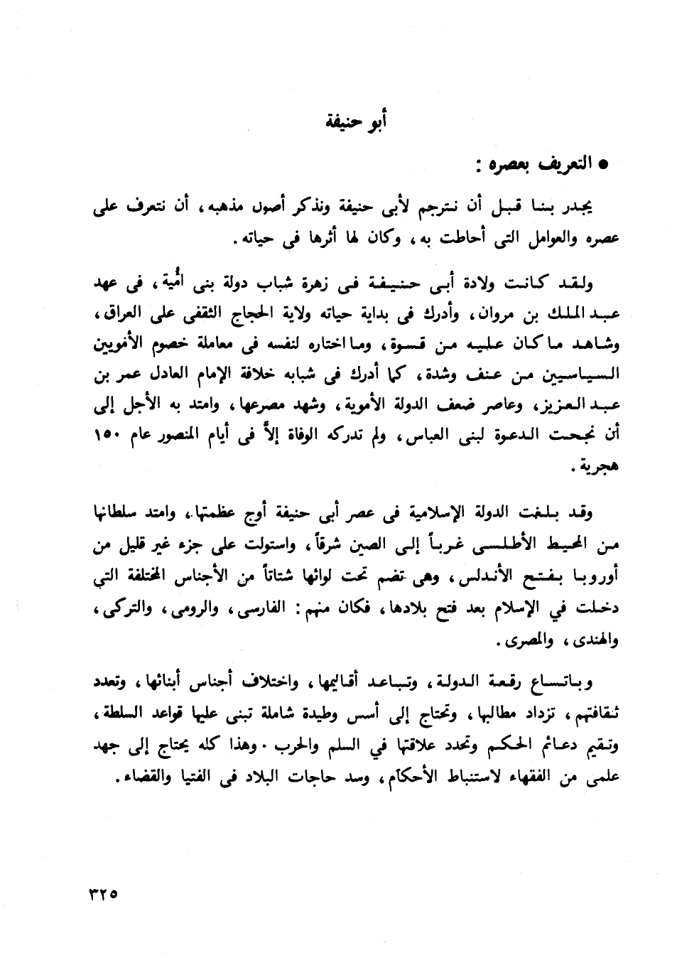 يجدر بنا قبل أن نترجم لأبي حنيفة ونذكر أصول مذهبه، أن نتعرف على عصره والعوامل التي أحاطت به، وكان لها أثرها في حياته.