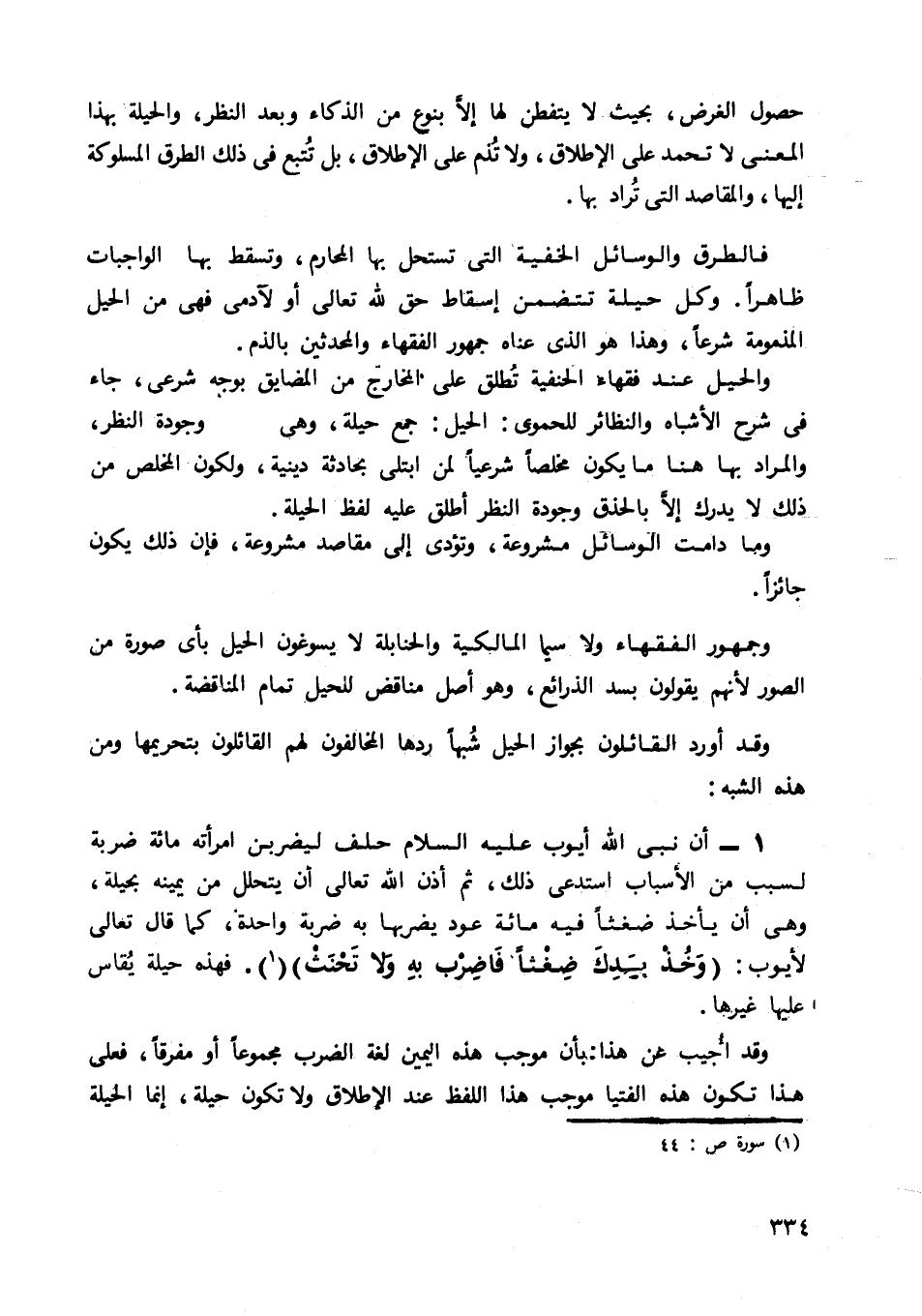 1- أن نبي الله أيوب عليه السلام حلف ليضربن امرأته مائة ضربة لسبب من الأسباب استدعى ذلك، ثم أذن الله تعالى أن يتحلل من يمينه بحيلة، وهي أن يأخذ ضغثا فيه مائة عود يضربها به ضربة واحدة، كما قال تعالى لأيوب: {وَخُذْ بِيَدِكَ ضِغْثًا فَاضْرِبْ بِهِ وَلا تَحْنَثْ} 1؛ فهذه حيلة يقاس عليها غيرها.