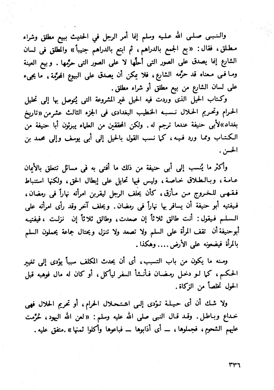 وأكثر ما ينسب إلى أبي حنيفة من ذلك ما أفتى به في مسائل تتعلق بالأيمان عامة، وبالطلاق خاصة، ليس فيها تحايل على إبطال الحق؛ ولكنها استنباط فقهي للخروج من مأزق، كأن يحلف الرجل ليقربن امرأته نهارا في رمضان، فيفتيه أبو حنيفة أن يسافر بها نهارا في رمضان، ويحلف آخر وقد رأى امرأته على السلم فيقول: أنت طالق ثلاثا إن صعدت، وطالق ثلاثا إن نزلت، فيفتيه أبو حنيفة أن تقف المرأة على السلم ولا تصعد ولا تنزل ويحتال جماعة يحملون السلم بالمرأة فيضعونه على الأرض ... وهكذا.
