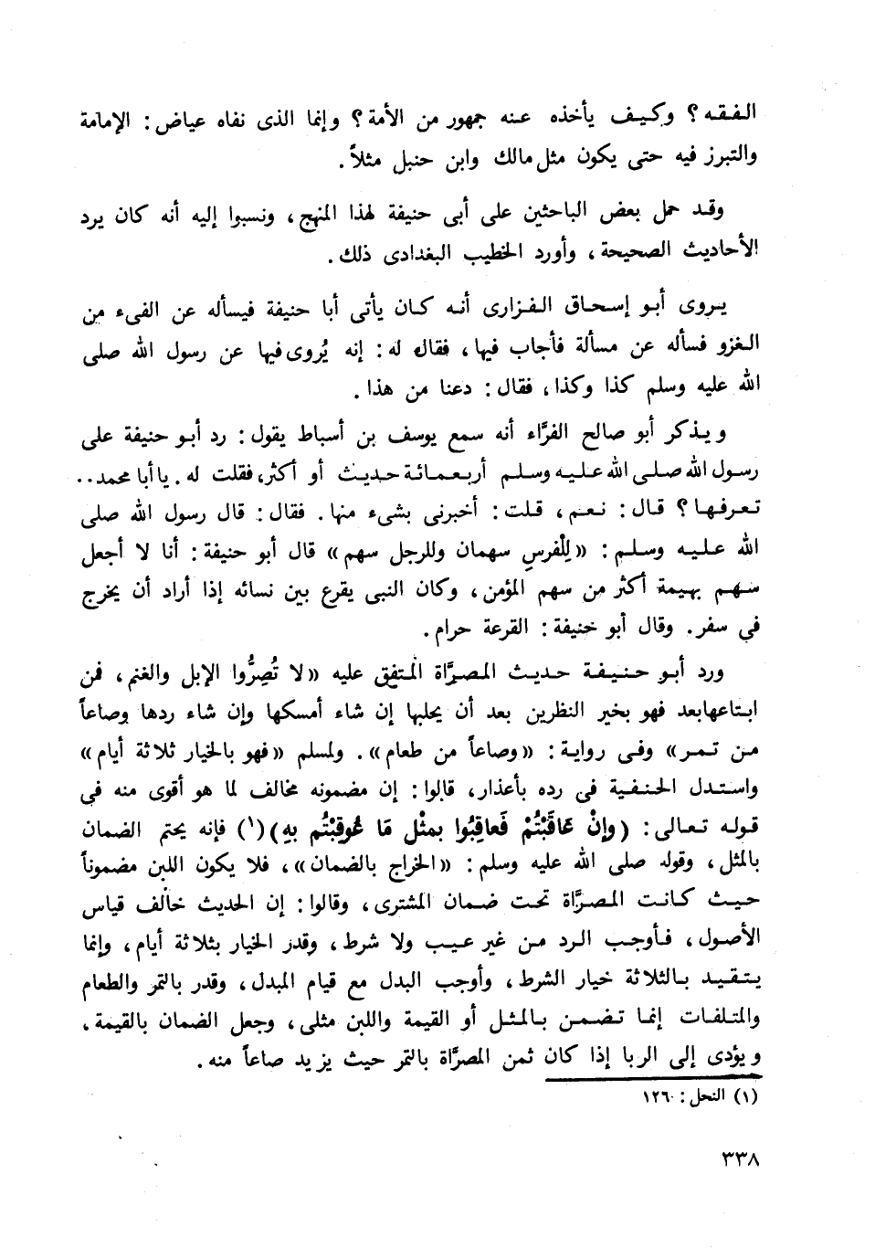ويذكر أبو صالح الفراء أنه سمع يوسف بن أسباط يقول: رد أبو حنيفة على رسول الله صلى الله عليه وسلم أربعمائة حديث أو أكثر؛ فقلت له: يا أبا محمد ... تعرفها؟ قال: نعم، قلت: أخبرني بشيء منها. فقال: قال رسول الله صلى الله عليه وسلم: "للفرس سهمان وللرجل سهم" قال أبو حنيفة: أنا لا أجعل سهم بهيمة أكثر من سهم المؤمن، وكان النبي يقرع بين نسائه إذا أراد أن يخرج في سفر. وقال أبو حنيفة: القرعة حرام.