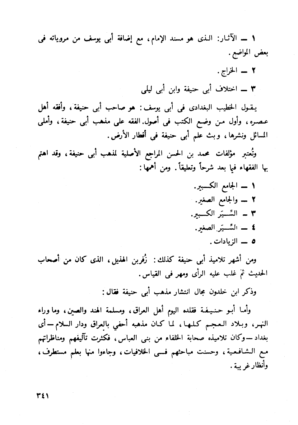 وأما أبو حنيفة فقلده اليوم أهل العراق، ومسلمة الهند والصين، وما وراء النهر، وبلاد العجم كلها، لما ان مذهبه أحفى بالعراق ودار السلام أي بغداد وكان تلاميذه صحابة الخلفاء من بني العباس؛ فكثرت تآليفهم ومناظراتهم مع الشافعية، وحسنت مباحثهم في الخلافيات، وجاءوا منها بعلم مستطرف، وأنظار غريبة.
