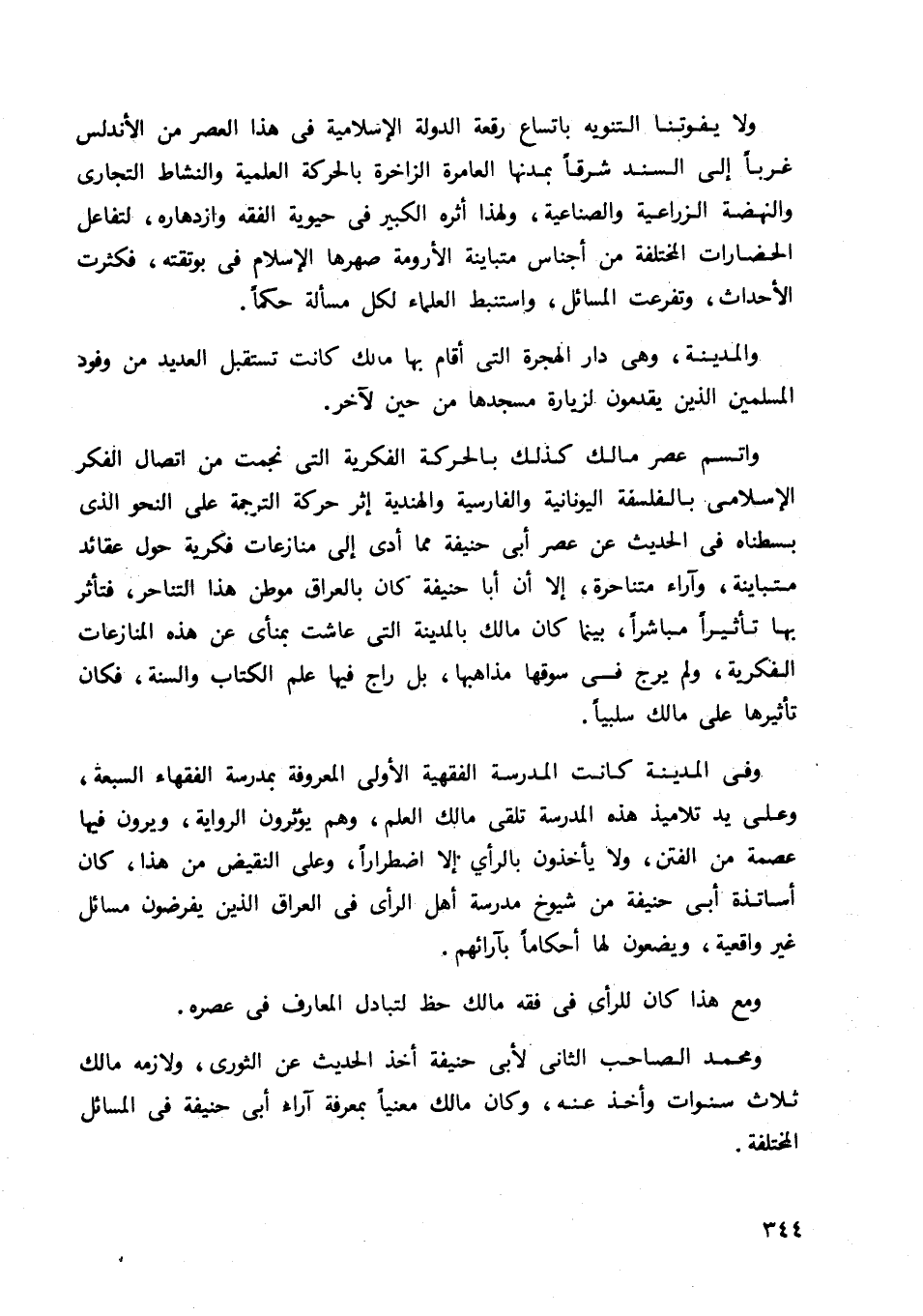 وفي المدينة كانت المدرسة الفقهية الأولى المعروفة بمدرسة الفقهاء السبعة، وعلى يد تلاميذ هذه المدرسة تلقى مالك العلم، وهم يؤثرون الرواية ويرون فيها عصمة من الفتن، ولا يأخذون بالرأي إلا اضطرارا، وعلى النقيض من هذا، كان أساتذة أبي حنيفة من شيوخ مدرسة أهل الرأي في العراق الذين يفرضون مسائل غير واقعية ويضعون لها أحكاما بآرائهم.