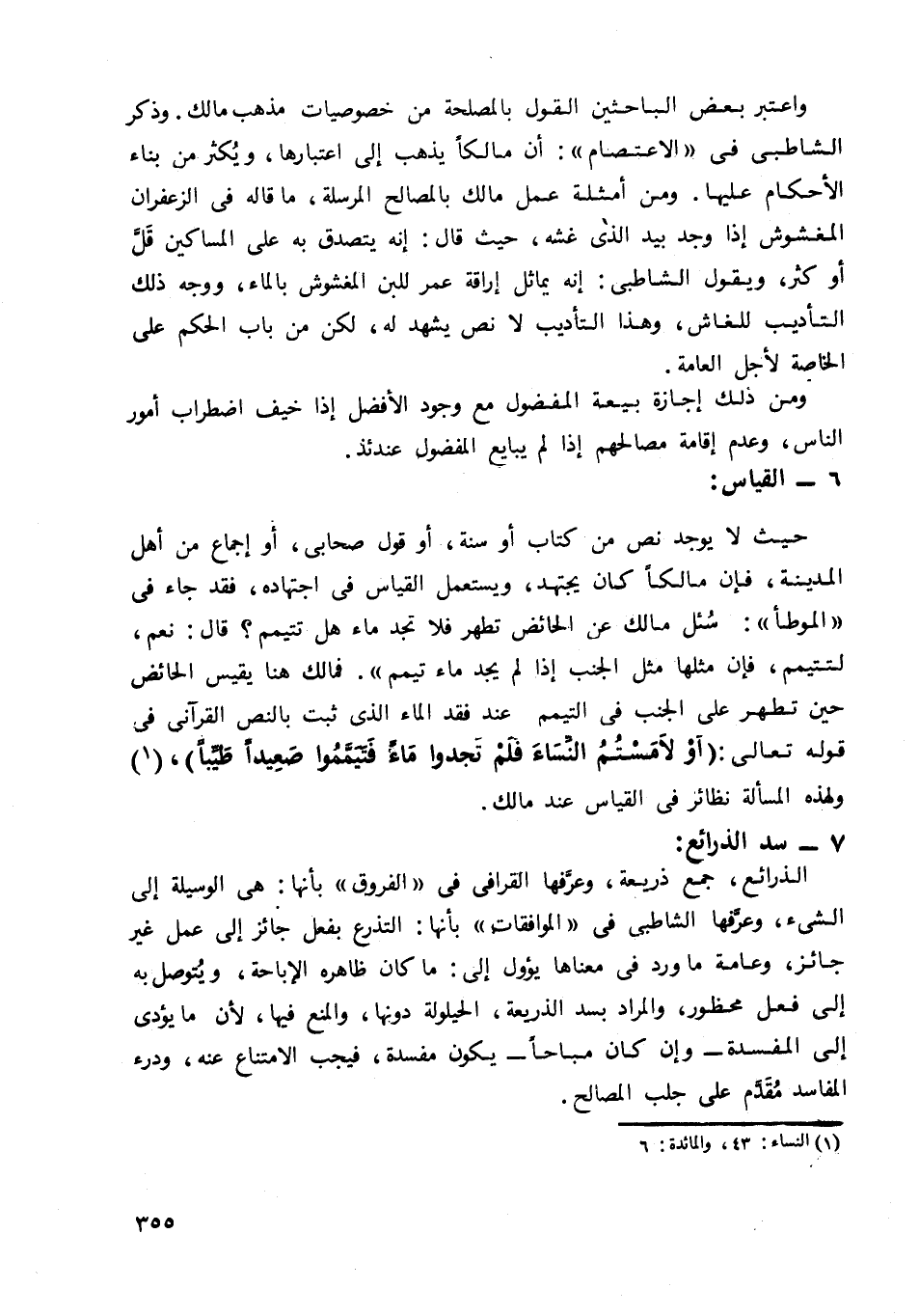 واعتبر بعض الباحثين القول بالمصلحة من خصوصيات مذهب مالك، وذكر الشاطبي في الاعتصام" أن مالكا يذهب إلى اعتبارها ويكثر من بناء الأحكام عليها. ومن أمثلة عمل مالك بالمصالح المرسلة، ما قاله في الزعفران المغشوش إذا وجد بيد الذي غشه، حيث قال: إنه يتصدق به على المساكين قل أو كثرة، ويقول الشاطبي، إنه يماثل إراقة عمر للبن المغشوش بالماء، ووجه ذلك التأديب للغاش، وهذا التأديب لا نص يشهد له؛ لكن من باب الحكم على الخاصة لأجل العامة.