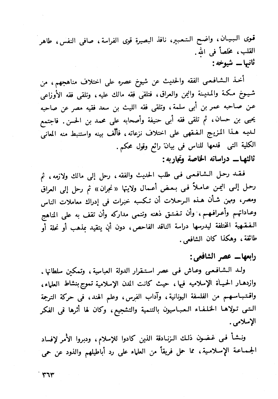 أخذ الشافعي الفقه والحديث عن شيوخ عصره على اختلاف مناهجهم، من شيوخ مكة والمدينة واليمن والعراق، فتلقى فقه مالك عليه، وتلقى فقه الأوزاعي عن صاحبه عمر بن أبي سلمة، وتلقى فقه الليث بن سعد فقه مصر عن صاحبه يحيى بن حسان، ثم تلقى فقه أبي حنيفة وأصحابه على محمد بن الحسن، فاجتمع الكلية التي قدمها للناس في بيان رائع وقول محكم.