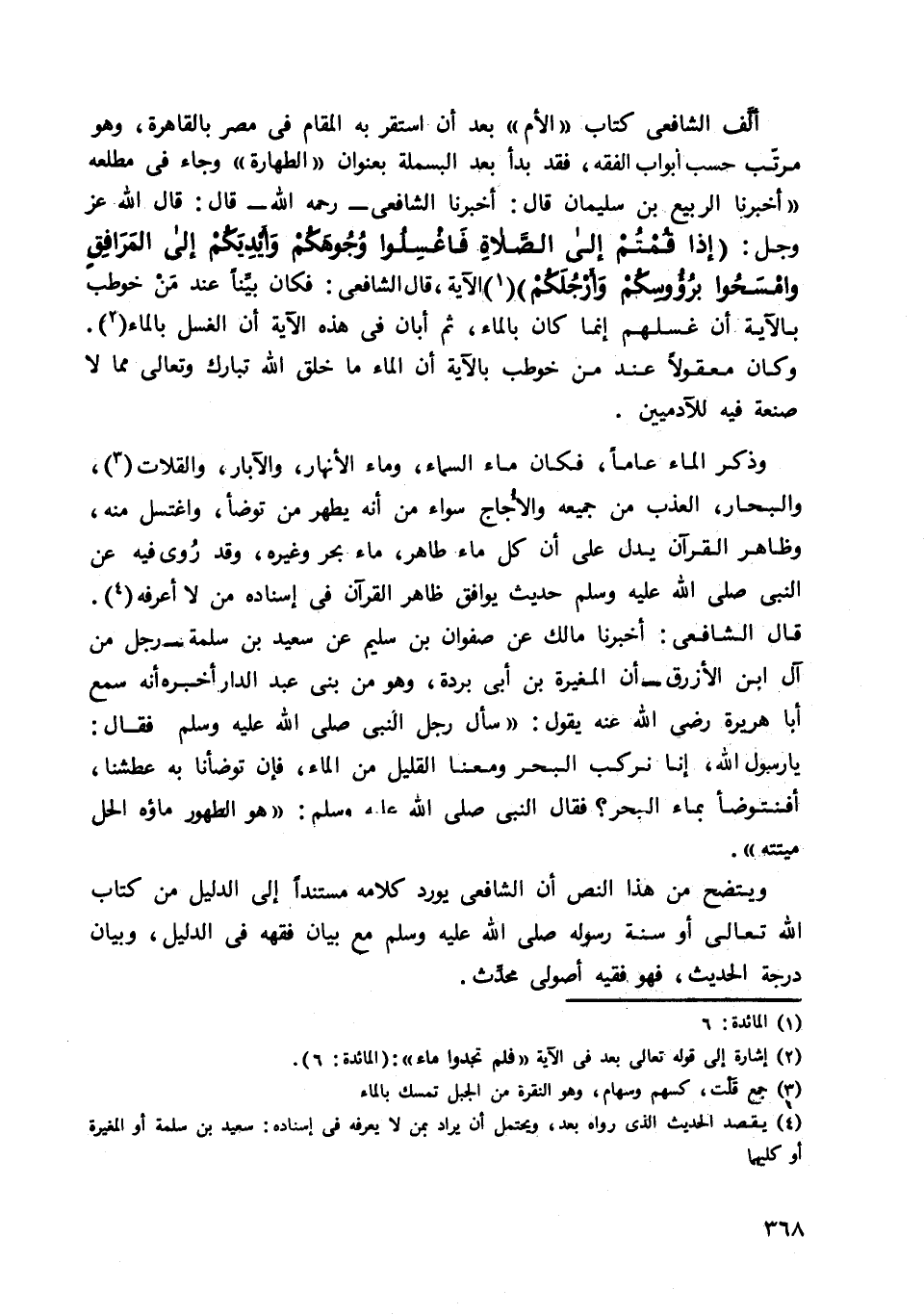 ألف الشافعي كتاب "الأم" بعد أن استقر به المقام في مصر بالقاهرة، وهو مرتب حسب أبواب الفقه؛ فقد بدأ بعد البسملة بعنوان "الطهارة" وجاء في مطلعه "أخبرنا الربيع بن سليمان قال: أخبرنا الشافعي -رحمه الله- قال: قال الله عز وجل: {إِذَا قُمْتُمْ إِلَى الصَّلاةِ فَاغْسِلُوا وُجُوهَكُمْ وَأَيْدِيَكُمْ إِلَى الْمَرَافِقِ وَامْسَحُوا بِرُؤُوسِكُمْ وَأَرْجُلَكُمْ} 1 الآية، قال الشافعي: فكان بينا عند من خوطب بالآية أن غسلهم إنما كان بالماء، ثم أبان في هذه الآية أن الغسل بالماء2. وكان معقولا عند من خوطب بالآية أن الماء ما خلق الله تبارك وتعالى مما لا صنعة فيه للآدميين.