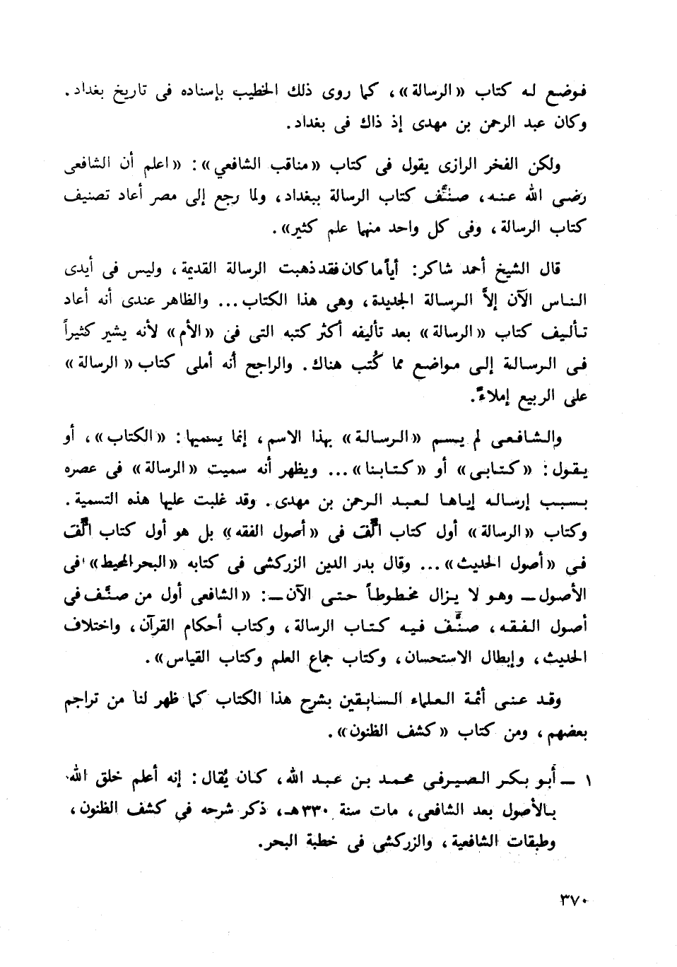 ولكن الفخر الرازي يقول في كتاب "مناقب الشافعي": "اعلم أن الشافعي رضي الله عنه، صنف كتاب الرسالة ببغداد، ولما رجع إلى مصر أعاد تصنبف كتاب الرسالة، وفي كل واحد منهما علم كثير".