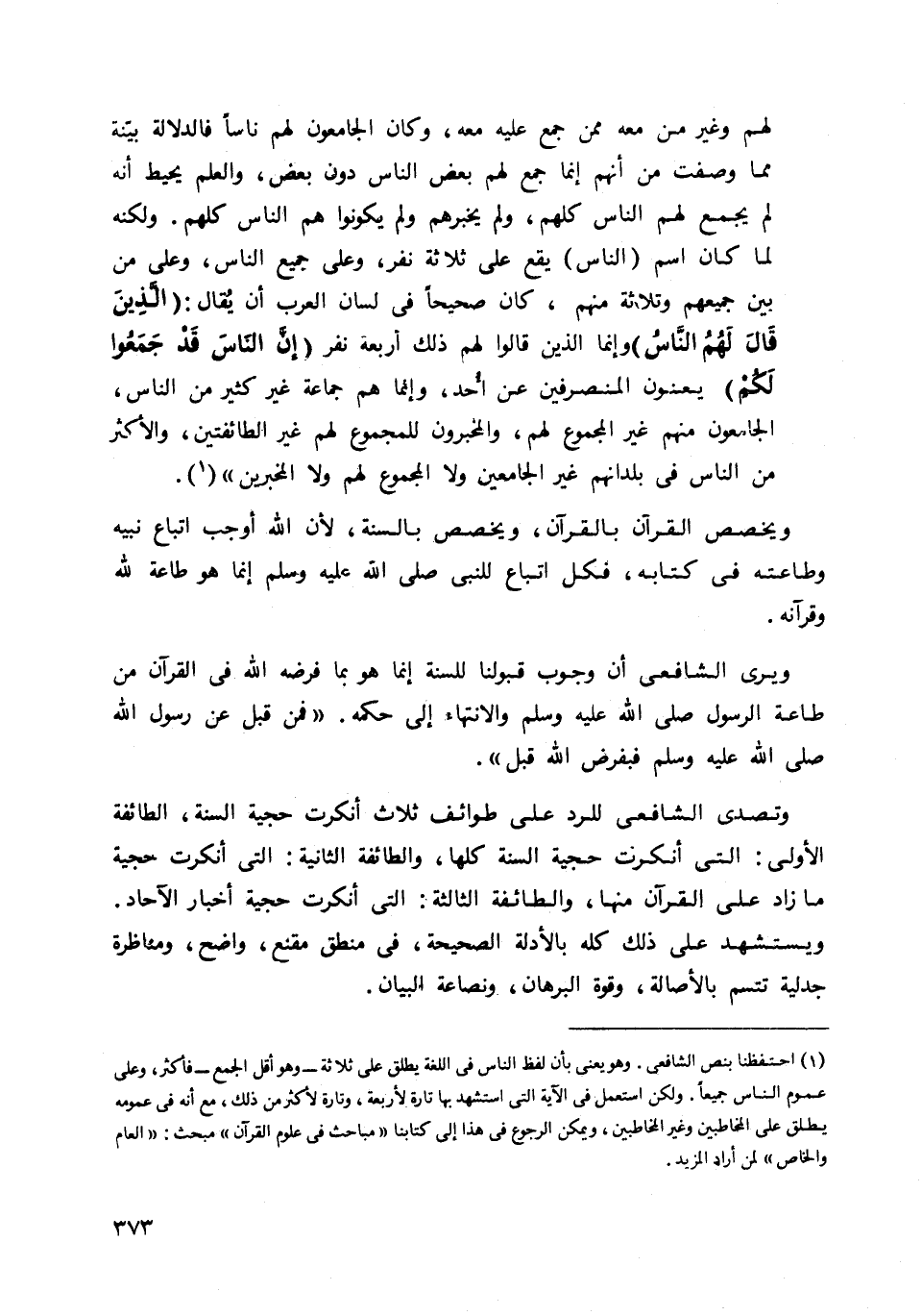 1 احتفظنا بنص الشافعي. وهو يعني بأن لفظ الناس في اللغة يطلق على ثلاثة -وهو أقل الجمع- فأكثر، وعلى عموم الناس جميعا. ولكن استعمل في الآية التي استشهد بها تارة لأربعة، وتارة لأكثر من ذلك، مع أنه في عمومه يطلق على المخاطبين وغير المخاطبين، ويمكن الرجوع في هذا إلى كتابنا "مباحث في علوم القرآن" مبحث: "العام والخاص" لمن أراد المزيد.