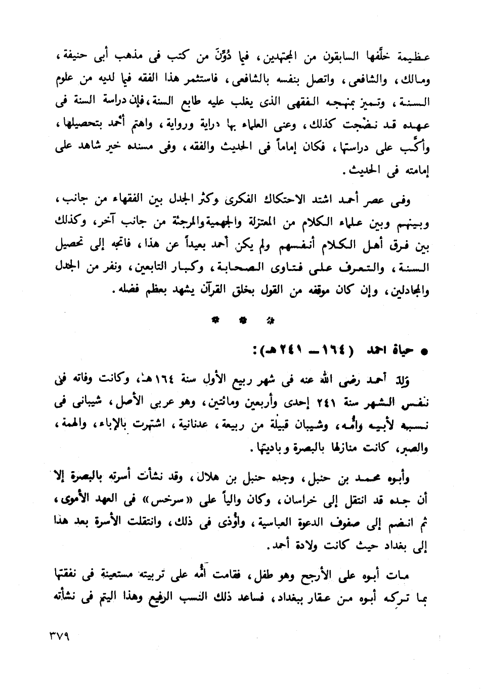 ولد أحمد رضي الله عنه في شهر ربيع الأول سنة 164هـ، وكانت وفاته في نفس الشهر سنة 241 إحدى وأربعين ومائتين، وهو عربي الأصل، شيباني في نسبه لأبيه وأمه، وشيبان قبيلة من ربيعة، عدنانية، اشتهرت بالإباء، والهمة، والصبر كانت منازلها بالبصرة وباديتها.