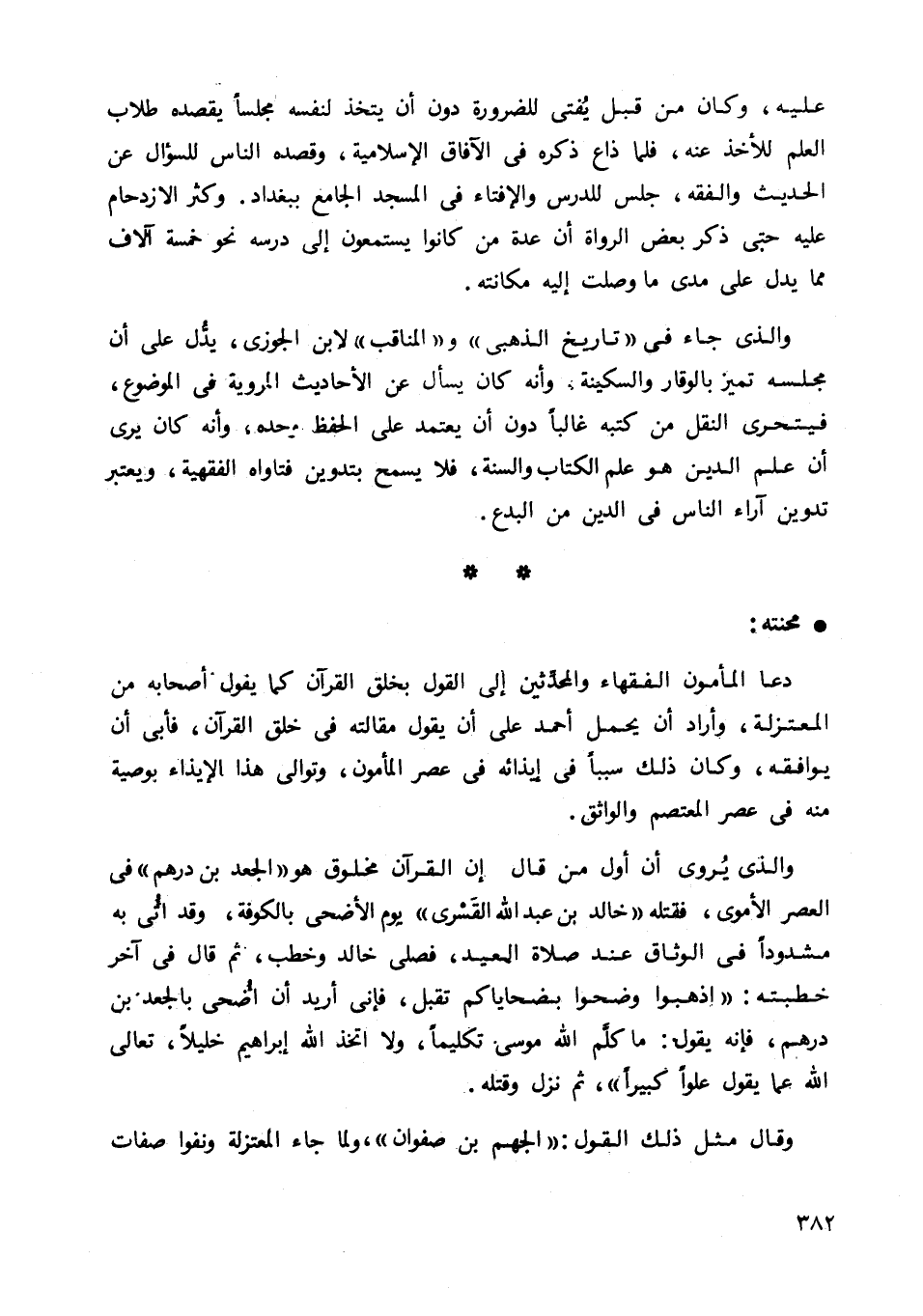 والذي يروى أن أول من قال إن القرآن مخلوق هو "الجعد بن درهم" في العصر الأموي، فقتله "خالد بن عبد الله القسري" يوم الأضحى بالكوفة،، وقد أتى به مشدودا في الوثائق عند صلاة العيد، فصلى خالد وخطب، ثم قال في آخر خطبته: "اذهبوا وضحوا بضحاياكم تقبل، فإني أريد أن أضحى بالجعد بن درهم، فإنه يقول: ما كلم الله موسى تكليما، ولا اتخذ الله إبراهيم خليلا، تعالى الله عما يقول علوا كبيرا"، ثم نزل وقتله.