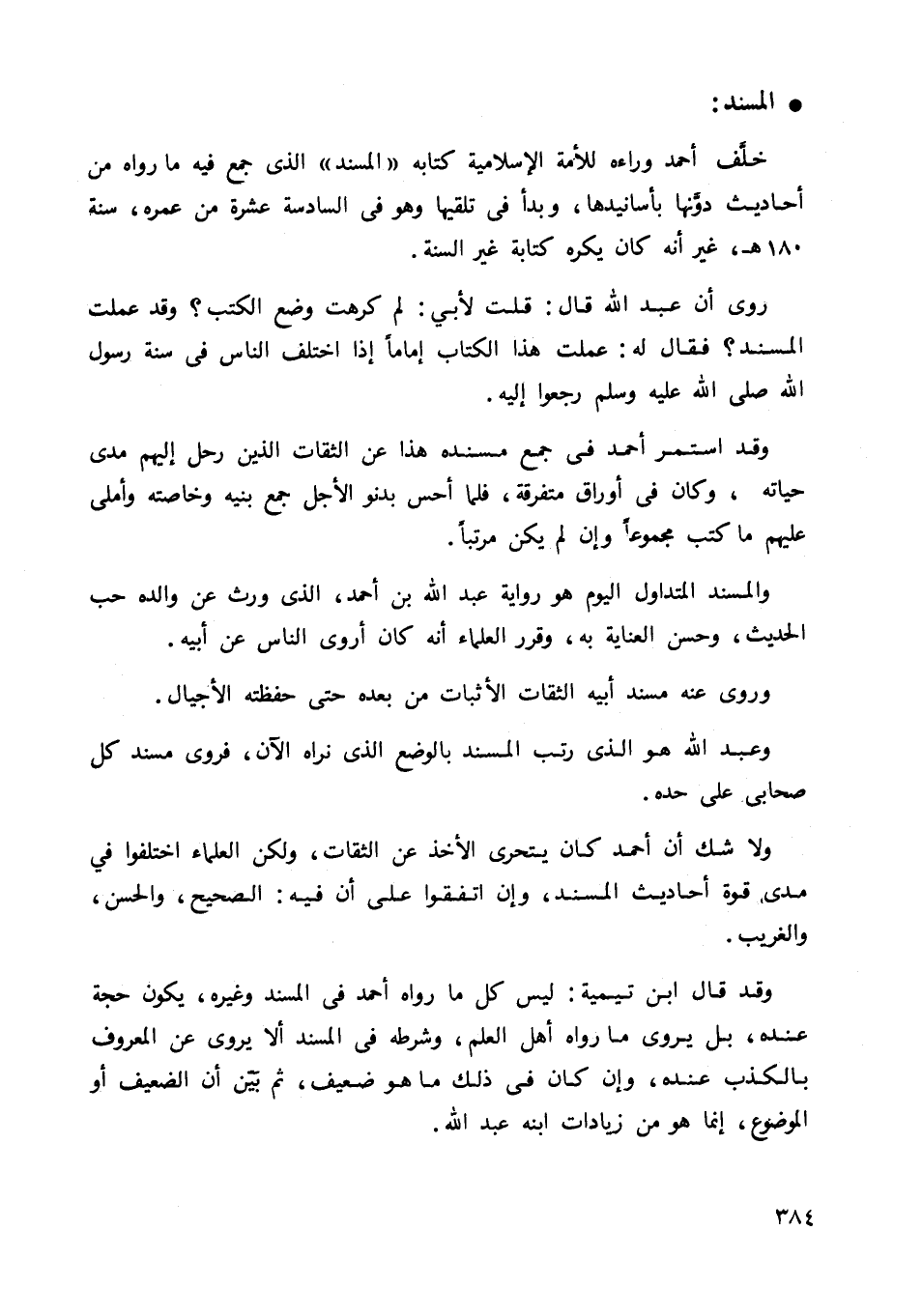 وقد قال ابن تيمية: ليس كل ما رواه أحمد في المسند وغيره، يكون حجة عنده؛ بل يروي ما رواه أهل العلم، وشرطه في المسند ألا يروي عن المعروف بالكذب عنده، وإن كان في ذلك ما هو ضعيف، ثم بين أن الضعيف أو الموضوع، إنما هو من زيادات ابنه عبد الله.