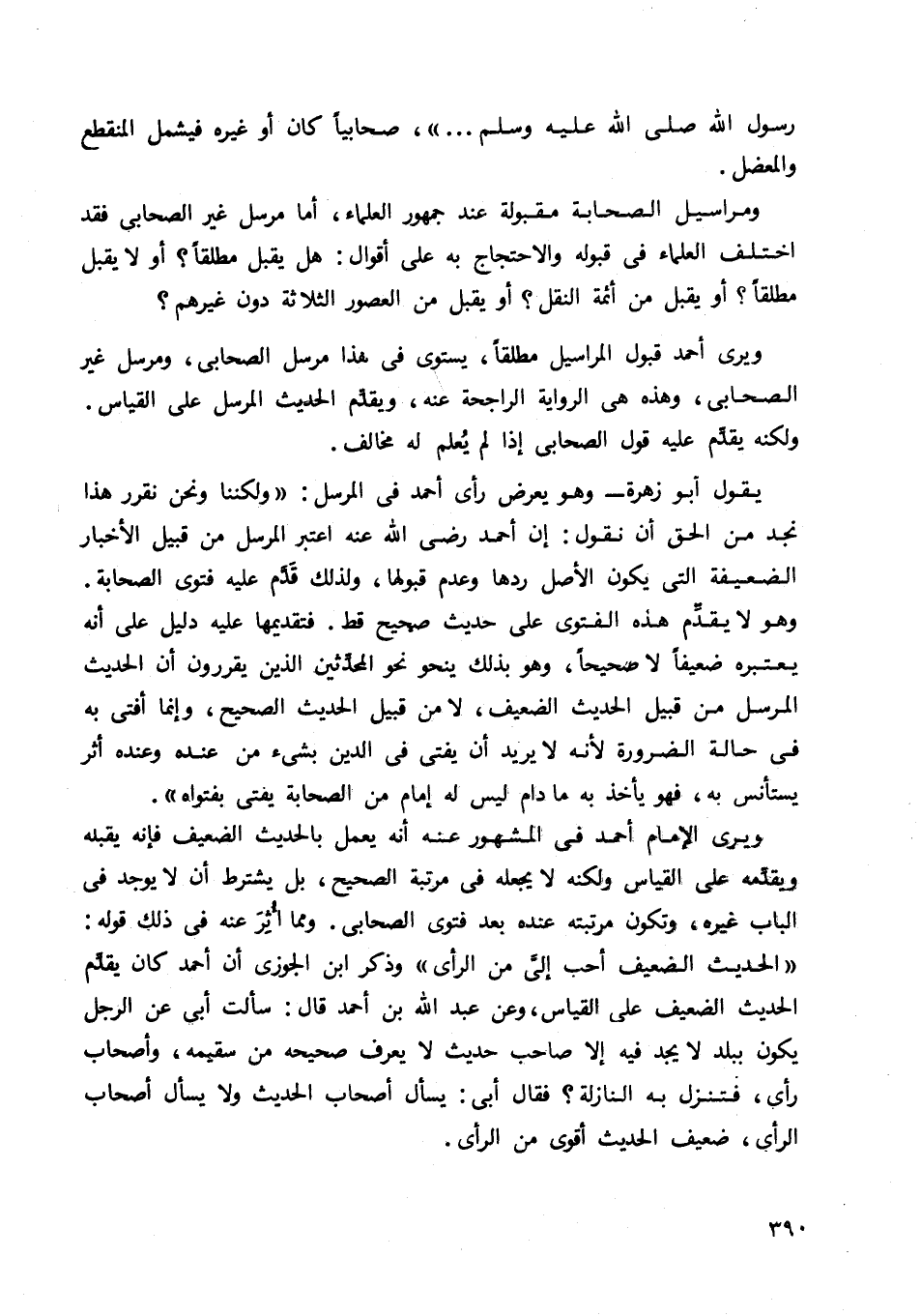 يقول أبو زهرة وهو يعرض رأي أحمد في المرسل: "ولكننا ونحن نقرر هذا نجد من الحق أن نقول: إن أحمد رضي الله عنه اعتبر المرسل من قبيل الأخبار الضعيفة التي يكون الأصل ردها وعدم قبولها، ولذلك قدم عليه فتوى الصحابة. وهو لا يقدم هذه الفتوى على حديث صحيح فقط. فتقديمها عليه دليل على أنه يعتبره ضعيفا لا صحيحا، وهو بذلك ينحو نحو المحدثين الذين يقررون أن الحديث المرسل من قبيل الحديث الضعيف، لا من قبيل الحديث الصحيح؛ وإنما أفتى به في حالة الضرورة لأنه لا يريد أن يفتي في الدين بشيء من عنده وعنده أثر يستأنس به؛ فهو يأخذ به ما دام ليس له إمام من الصحابة يفتي بفتواه".