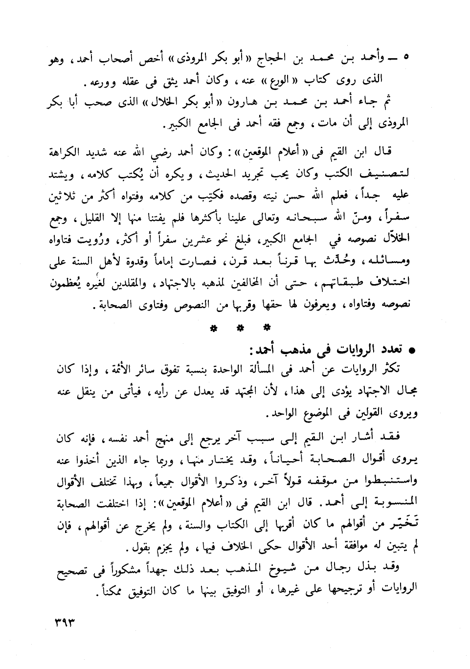 فقد أشار ابن القيم إلى سبب آخر يرجع إلى منهج أحمد نفسه؛ فإنه كان يروى أقوال الصحابة أحيانا. وقد يختار منها، وربما جاء الذين أخذوا عنه واستنبطوا من موقفه قولا آخر، وذكروا الأقوال جميعا، وبهذا تختلف الأقوال المنسوبة إلى أحمد. قال ابن القيم في "إعلام الموقعين". إذا اختلفت الصحابة تخير من أقوالهم ما كان أقربها إلى الكتابة والسنة، ولم يخرج عن أقوالهم؛ فإن لم يتبين له موافقة أحد الأقوال حكى الخلاف فيها، ولم يجزم بقول.