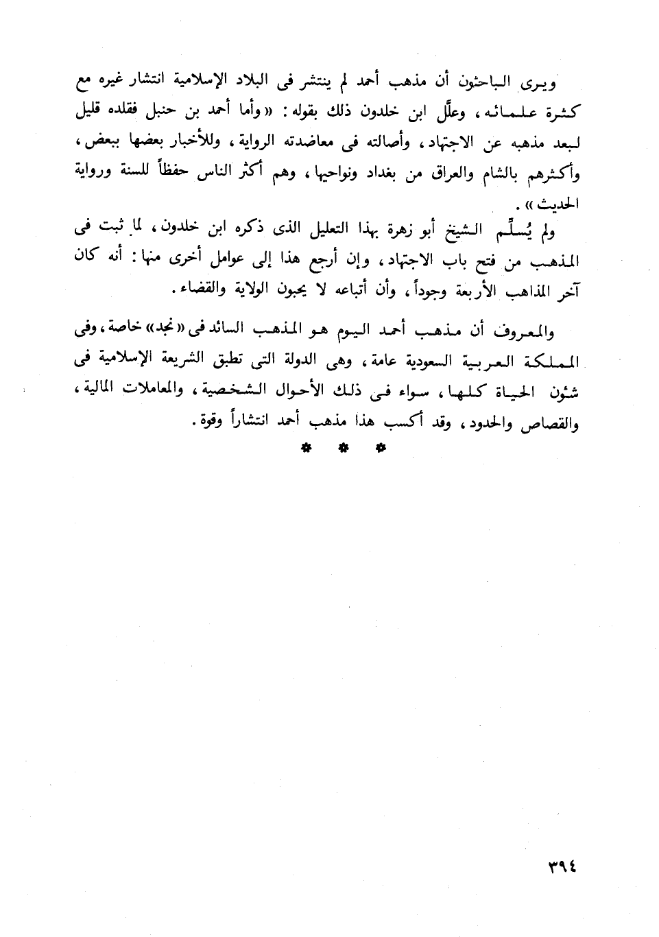 ولم يسلم الشيخ أبو زهرة بهذا التعليل الذي ذكره ابن خلدون، لما ثبت في المذهب من فتح باب الاجتهاد، وإن أرجع هذا إلى عوامل أخرى منها: أنه كان آخر المذاهب الأربعة وجودا، وأن أتباعه لا يحبون الولاية والقضاء.