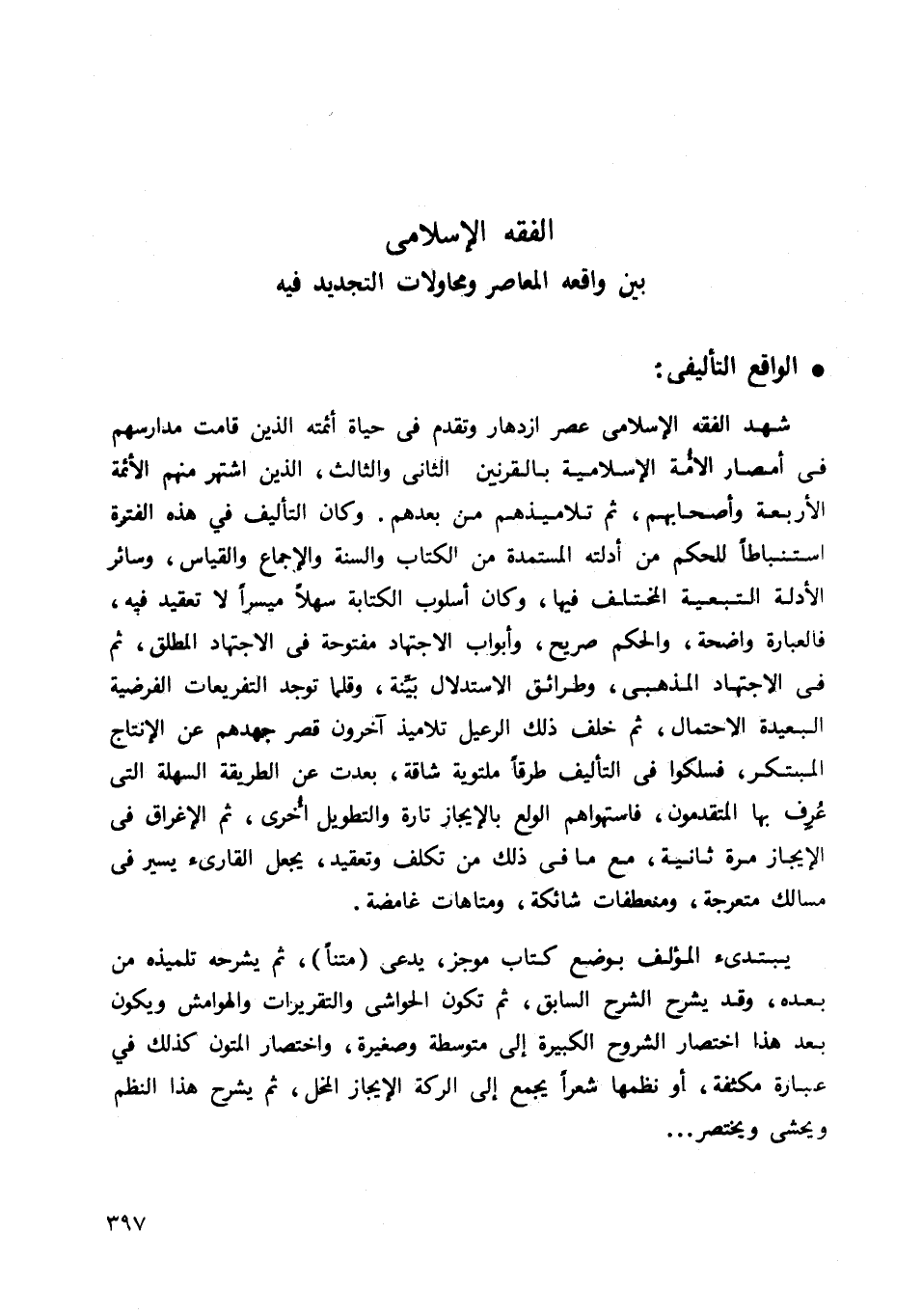 شهد الفقه الإسلامي عصر ازدهار وتقدم في حياة أئمته الذين قامت مدراسهم في أمصار الأمة الإسلامية بالقرنين الثاني والثالث، الذين اشتهر منهم الأئمة الأربعة وأصحابهم، ثم تلاميذهم من بعدهم. وكان التأليف في هذه الفترة استنباطا للحكم من أدلته المستمدة من الكتاب والسنة والإجماع والقياس، وسائر الأدلة التبعية المختلف فيها، وكان أسلوب الكتابة سهلا ميسرا لا تعقيد فيه، فالعبارة واضحة، والحكم صريح، وأبواب الاجتهاد مفتوحة في الاجتهاد المطلق، ثم في الاجتهاد المذهبي، وطرائق الاستدلال بينة، وقلما توجد التفريعات الفرضية البعيدة الاحتمال، ثم خلف ذلك الرعيل تلاميذ آخرون قصر جهدهم عن الإنتاج المبتكر فسلكوا في التأليف طرقا ملتوية شاقة، بعدت عن الطريقة السهلة التي عرف بها المتقدمون، فاستهواهم الولع بالإيجاز تارة والتطويل أخرى، ثم الإغراق في الإيجاز مرة ثانية، مع ما في ذلك من تكلف وتعقيد، يجعل القارئ يسير في مسالك متعرجة، ومنعطفات شائكة، ومتاهات غامضة.
