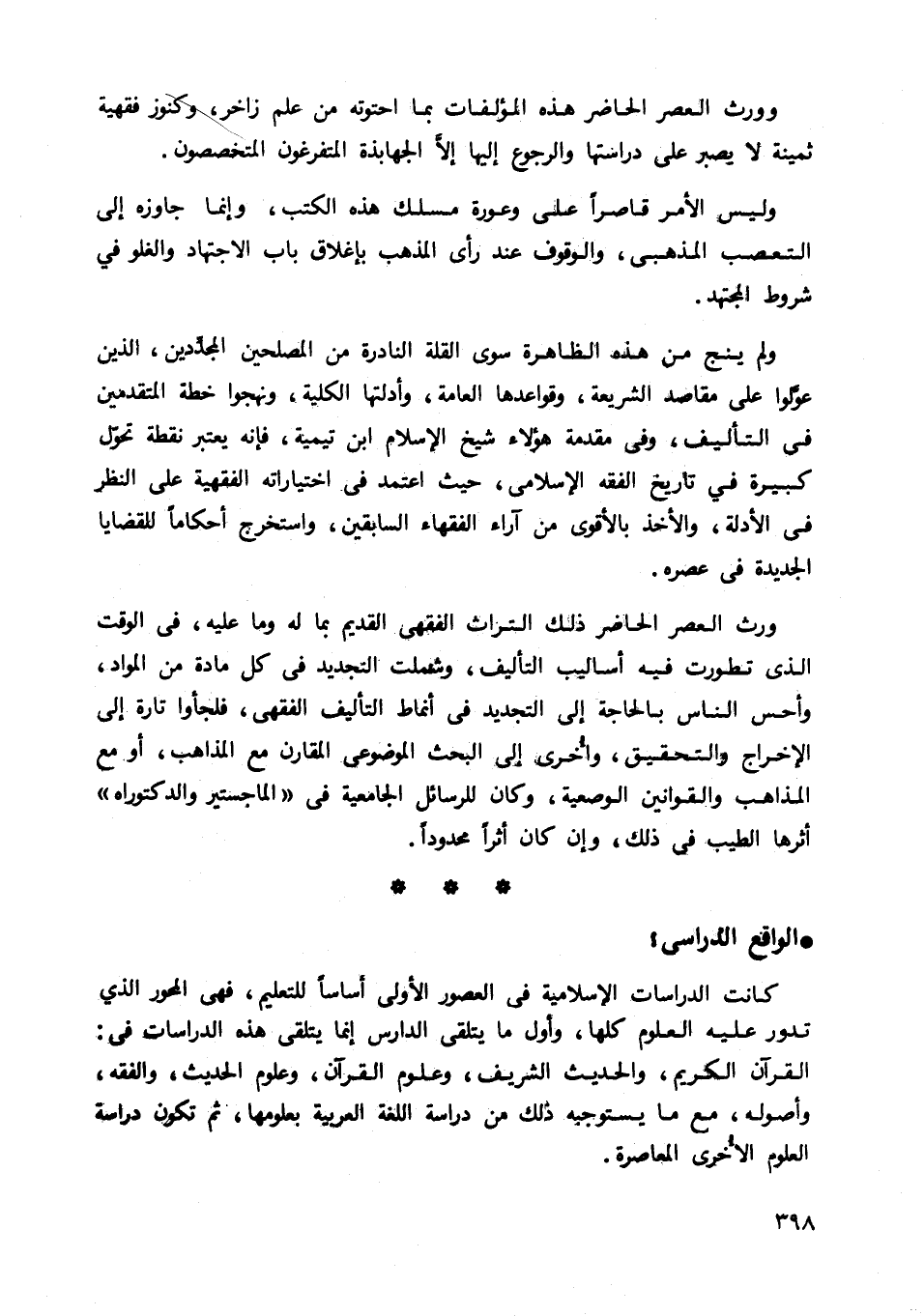 ورث العصر الحاضر ذلك التراث الفقهي القديم بما له وما عليه، في الوقت الذي تطورت فيه أساليب التأليف، وشملت التجديد في كل مادة من المواد، وأحس الناس بالحاجة إلى التجديد في أنماط التأليف الفقهي، فلجئوا تارة إلى الإخراج والتحقيق، وأخرى إلى البحث الموضوعي المقارن مع المذاهب، أو مع المذاهب والقوانين الوصعية، وكان للرسائل الجامعية في الماجستير والدكتوراه" أثرها الطيب في ذلك، وإن كان أثرا محدودا.