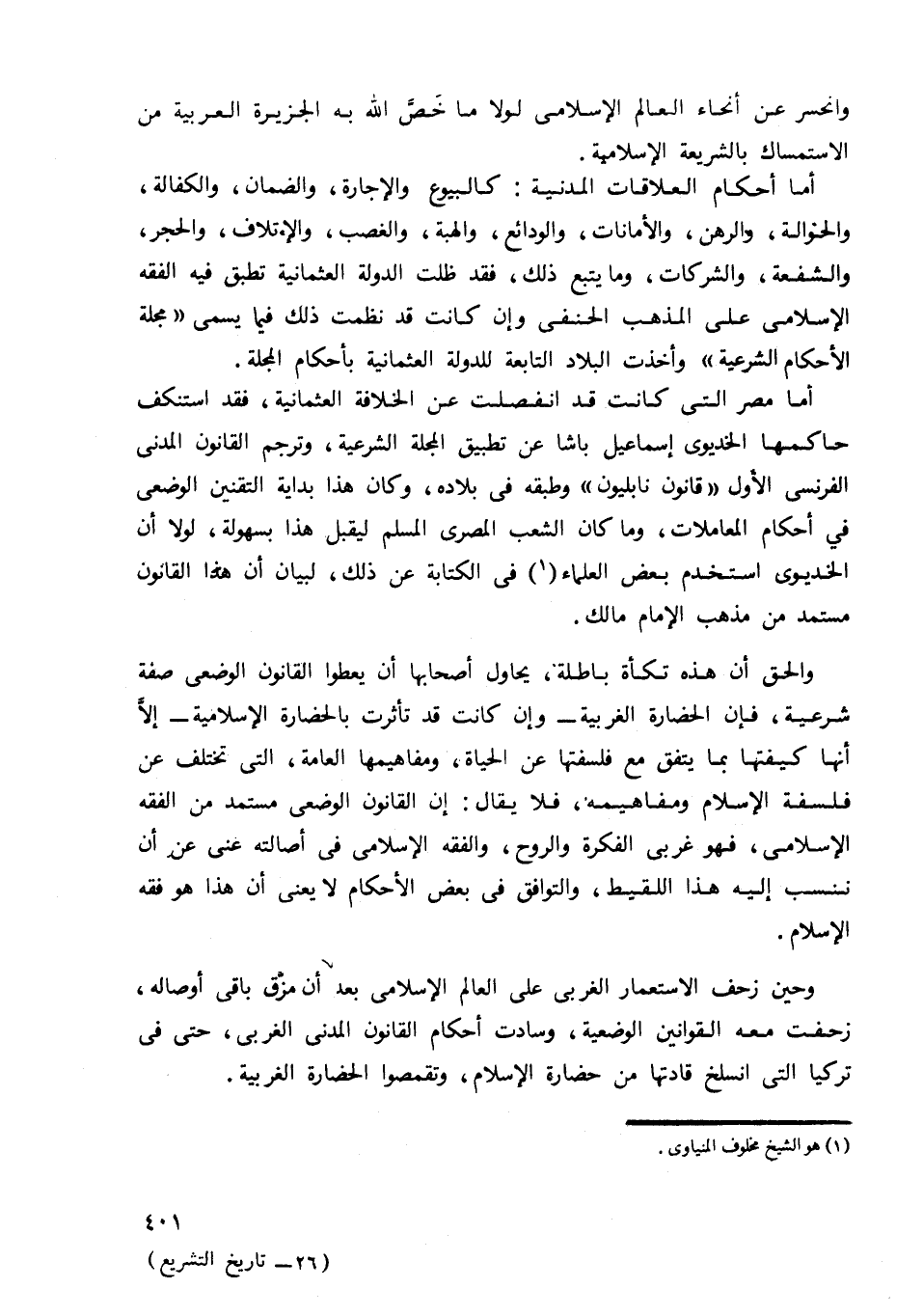 أما مصر التي كانت قد انفصلت عن الخلافة العثمانية؛ فقد استنكف حاكمها الخديوي إسماعيل باشا عن تطبيق المجلة الشرعية، وترجم القانون المدني الفرنسي الأول "قانون نابليون" وطبقة في بلاده، وكان هذا بداية التقنين الوضعي في أحكام المعاملات، وما كان الشعب المصري المسلم ليقبل هذا بسهولة، لولا أن الخديوي استخدم بعض العلماء1 في الكتابة عن ذلك، لبيان أن هذا القانون مستمد من مذهب الإمام مالك.