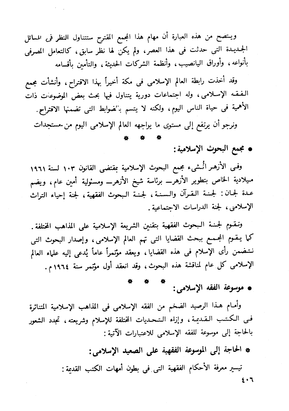 ويتضح من هذه العبارة أن مهام هذا المجمع المقترح ستتناول النظر في المسائل الجديدة التي حدثت في هذا العصر، ولم يكن لها نظر سابق، كالتعامل المصرفي بأنواعه، وأوراق اليانصيب، وأنظمة الشركات الحديثة والتأمين بأقسامه.