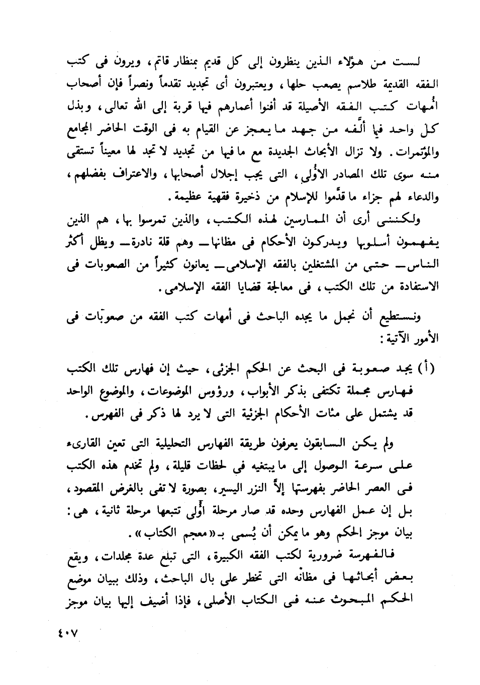 لست من هؤلاء الذين ينظرون إلى كل قديم بمنظار قاتم، ويرون في كتب الفقه القديم طلاسم يصعب حلها، ويعتبرون أي تجديد تقدما ونصرا فإن أصحاب أمهات كتب الفقه الأصيلة قد أفنوا أعمارهم فيها قربة إلى الله تعالى، وبذل كل واحد فيما ألفه من جهد ما يعجز عن القيام به في الوقت الحاضر المجامع والمؤتمرات، ولا تزال الأبحاث الجديدة مع ما فيها من تجديد لا تجد لها معينا تستقي منه سوى تلك المصادر الأولى، التي يجب إجلال أصحابها، والاعتراف بفضلهم، والدعاء لهم جزاء ما قدموا للإسلام من ذخيرة فقهية عظيمة؛ ولكنني أرى أن الممارسين لهذه الكتب، والذين تمرسوا بها، هم الذين يفهمون أسلوبها ويدركون الأحكام في مظانها -وهم قلة نادرة- ويظل أكثر الناس -حتى من المشتغلين بالفقه الإسلامي- يعانون كثيرا من الصعوبات في الاستفادة من تلك الكتب، في معالجة قضايا الفقه الإسلامي.