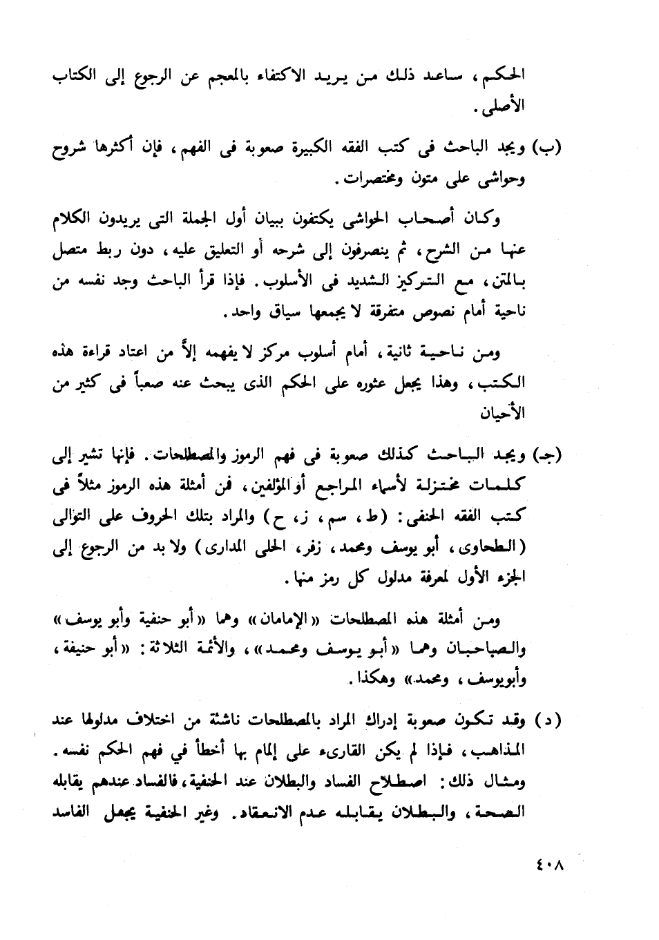 ومن ناحية ثانية، أمام أسلوب مركز لا يفهمه إلا من اعتاد قراءة هذه الكتب، وهذا يجعل عثوره على الحكم الذي يبحث عنه صعبا في كثير من الأحيان.