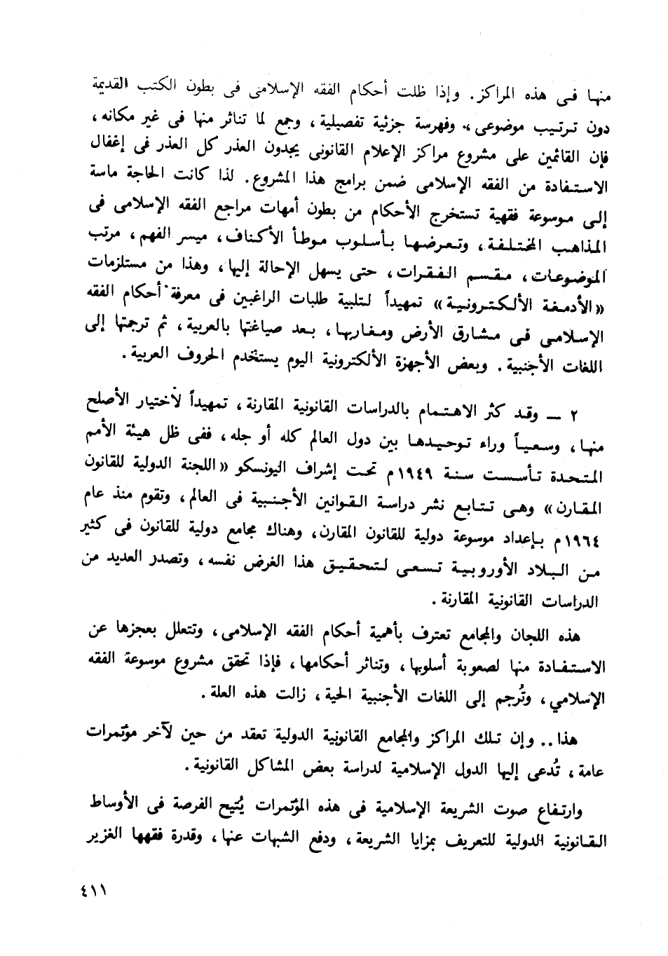 منها في هذه المراكز. وإذا ظلت أحكام الفقه الإسلامي في بطون الكتب القديمة دون ترتيب موضوعي، وفهرسة جزئية تفصيلية، وجمع لما تناثر منها في غير مكانه؛ فإن القائمين على مشروع مراكز الإعلام القانوني يجدون العذر كل العذر في إغفال الاستفادة من الفقه الإسلامي ضمن برامج هذا المشروع. لذا كانت الحاجة ماسة إلى موسوعة فقهية تستخرج الأحكام من بطون أمهات مراجع الفقه الإسلامي في المذاهب المختلفة، وتعرضها بأسلوب موطأ الأكناف، ميسر الفهم، مرتب الموضوعات، مقسم الفقرات، حتى يسهل الإحالة إليها، وهذا من مستلزمات "الأدمغة الإلكترونية" تمهيدا لتلبية طلبات الراغبين في معرفة أحكام الفقه الإسلامي في مشارقة الأرض ومغاربها، بعد صياغتها بالعربية، ثم ترجمتها إلى اللغات الأجنبية، وبعض الأجهزة الإلكترونية اليوم يستخدم الحروف العربية.