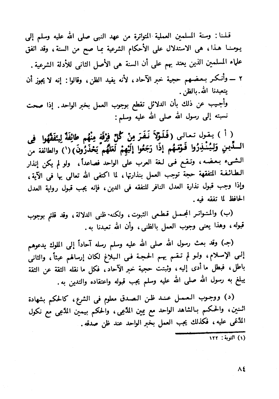 "أ" يقول تعالى: {فَلَوْلا نَفَرَ مِنْ كُلِّ فِرْقَةٍ مِنْهُمْ طَائِفَةٌ لِيَتَفَقَّهُوا فِي الدِّينِ وَلِيُنْذِرُوا قَوْمَهُمْ إِذَا رَجَعُوا إِلَيْهِمْ لَعَلَّهُمْ يَحْذَرُونَ} 1 والطائفة من الشيء بعضه، وتقع في لغة العرب على الواحد فصاعدا، ولو لم يكن إنذار الطائفة المتفقهة حجة توجب العمل بنذارتها، لما اكتفى الله تعالى بها في الآية، وإذا وجب قبول نذارة العدل النافر للتفقه في الدين، فإنه يجب قبول رواية العدل الحافظ لما تفقه فيه.