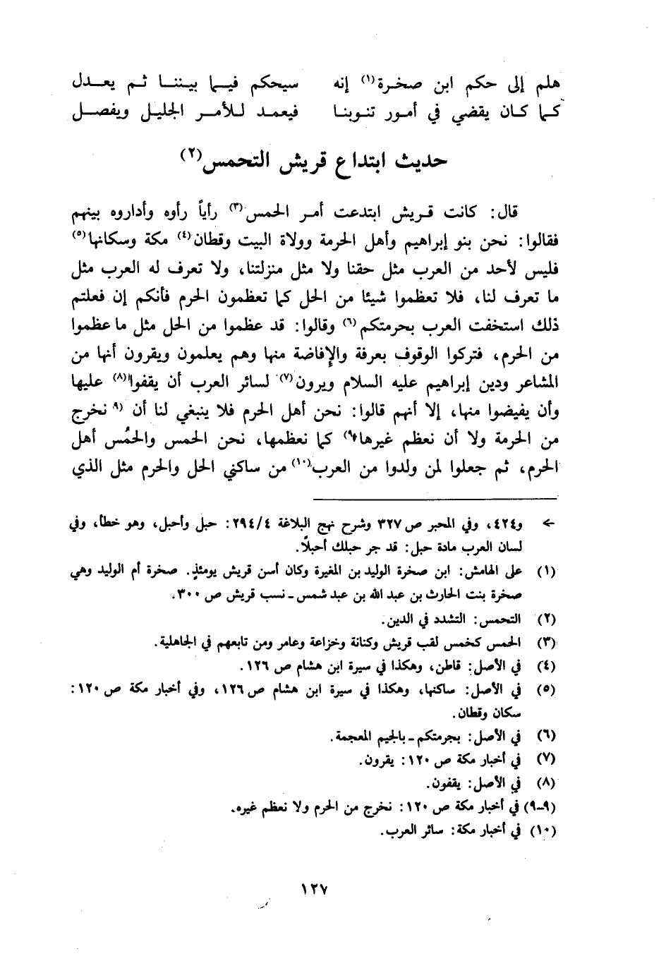 قال: كانت قريش ابتدعت أمر الحمس [3] رأيا رأوه وأداروه بينهم فقالوا: نحن بنو إبراهيم وأهل الحرمة وولاة البيت وقطان [4] مكة وسكانها [5] فليس لأحد من العرب مثل حقنا ولا مثل منزلتنا، ولا تعرف له العرب مثل ما تعرف لنا، فلا تعظموا شيئا من الحل كما تعظمون الحرم فإنكم إن فعلتم ذلك استخفت العرب بحرمتكم [6] وقالوا: قد عظموا من الحل مثل ما عظموا من الحرم، فتركوا الوقوف بعرفة والإفاضة منها وهم يعلمون ويقرون أنها من المشاعر ودين إبراهيم عليه السلام ويرون [7] لسائر العرب أن يقفوا [8] عليها وأن يفيضوا منها، إلا أنهم قالوا: نحن أهل الحرم فلا ينبغي لنا أن [9] نخرج من الحرمة ولا أن نعظم غيرها [9] كما نعظمها، نحن الحمس والحمس أهل الحرم، ثم جعلوا لمن ولدوا من العرب [10] من ساكني الحل والحرم مثل الذي