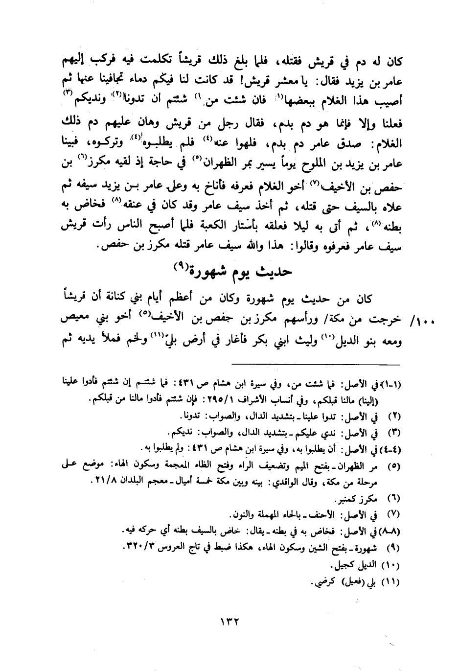 كان من حديث يوم شهورة وكان من أعظم أيام بني كنانة أن قريشا خرجت من مكة/ ورأسهم مكرز بن حفص بن الأخيف [5] أخو بني معيص ومعه بنو الديل [10] وليث ابني بكر فأغار في أرض بليّ [11] ولخم فملأ يديه ثم