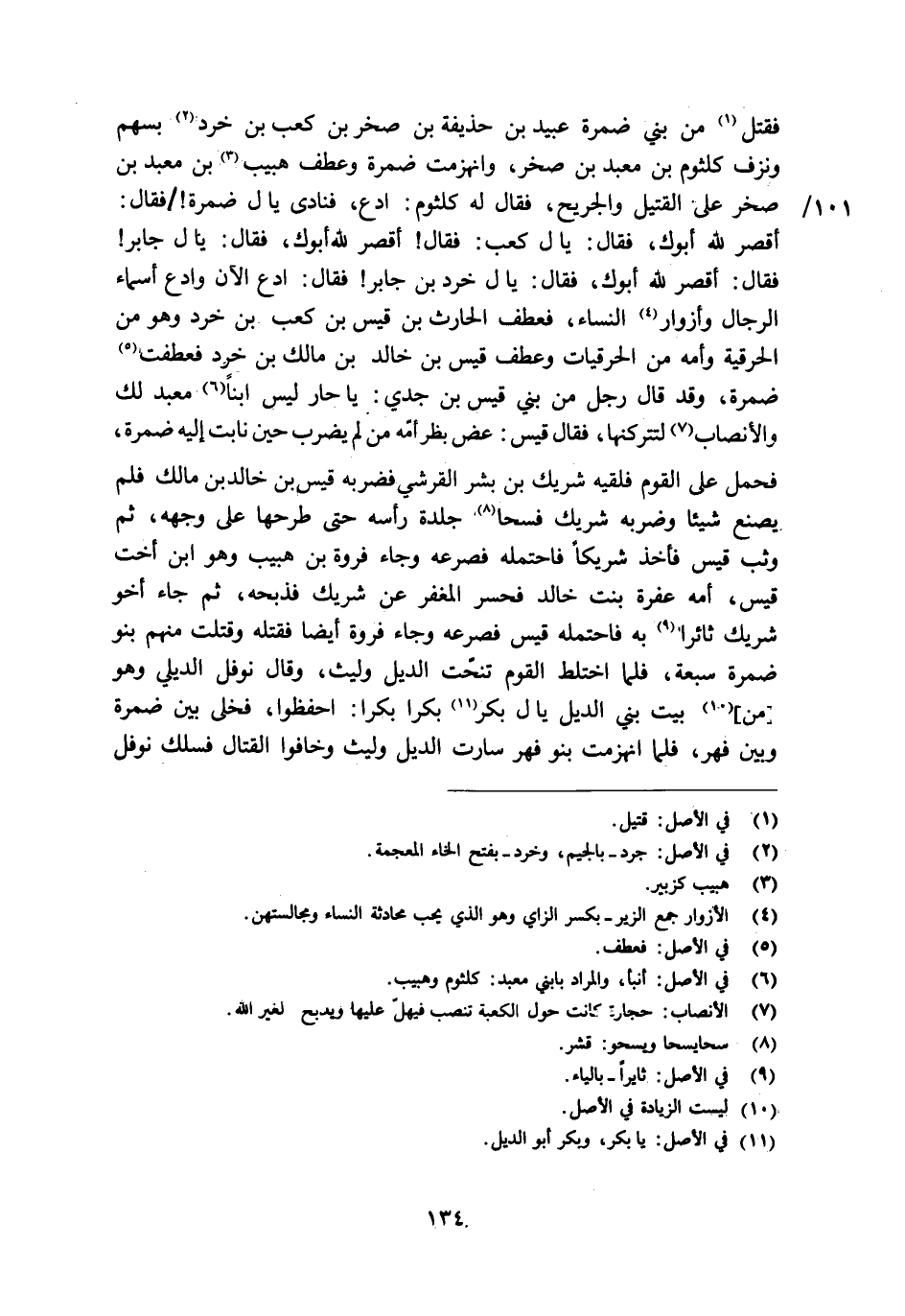 أقصر لله أبوك، فقال: يال كعب: فقال! أقصر لله أبوك، فقال: يال جابر! فقال: أقصر لله أبوك، فقال: يال خرد بن جابر! فقال: ادع الآن وادع أسماء الرجال وأزوار [4] النساء، فعطف الحارث بن قيس بن كعب بن خرد وهو من الحرقية وأمه من الحرقيات وعطف قيس بن خالد بن مالك بن خرد فعطفت [5] ضمرة، وقد قال رجل من بني قيس بن جدي: يا حار ليس ابنا [6] معبد لك والأنصاب [7] لتتركنها، فقال قيس: عض بظر أمّه من لم يضرب حين نابت إليه ضمرة، فحمل على القوم فلقيه شريك بن بشر القرشي فضربه قيس بن خالد بن مالك فلم يصنع شيئا وضربه شريك فسحا [8] جلدة رأسه حتى طرحها على وجهه، ثم وثب قيس فأخذ شريكا فاحتمله فصرعه وجاء فروة بن هبيب وهو ابن أخت قيس، أمه عفرة بنت خالد فحسر المغفر عن شريك فذبحه، ثم جاء أخو شريك ثائرا [9] به فاحتمله قيس فصرعه وجاء فروة أيضا فقتله وقتلت منهم بنو ضمرة سبعة، فلما اختلط القوم تنحّت الديل وليث، وقال نوفل الديلي وهو [من] [10] بيت بني الديل يال بكر [11] بكرا بكرا: احفظوا، فخلى بين ضمرة وبين فهر، فلما انهزمت بنو فهر سارت الديل وليث وخافوا القتال فسلك نوفل