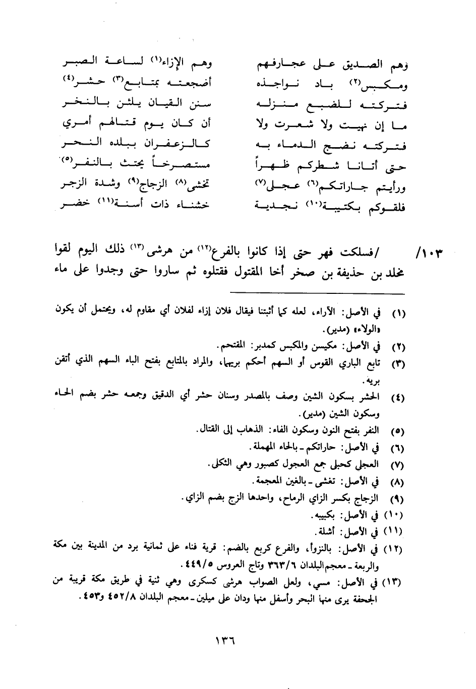 فسلكت فهر حتى إذا كانوا بالفرع [12] من هرشى [13] ذلك اليوم لقوا مخلد بن حذيفة بن صخر أخا المقتول فقتلوه ثم ساروا حتى وجدوا على ماء