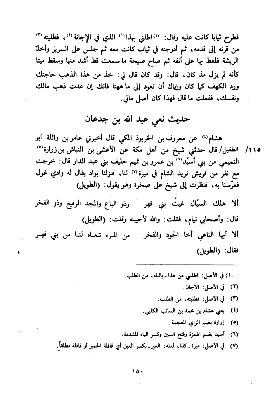 هشام [4] عن معروف بن الخربوذ المكي قال أخبرني عامر بن واثلة أبو الطفيل قال حدثني شيخ من أهل مكة عن الأعشى بن النباش بن زرارة [5] التميمي من بني أسيّد [6] بن عمرو بن تميم حليف بني عبد الدار قال: خرجت مع نفر من قريش نريد الشام في ميرة [7] لنا، فنزلنا بواد يقال له وادي غول فعرّسنا به، فنظرت إلى شيخ على صخرة وهو يقول: (الطويل)