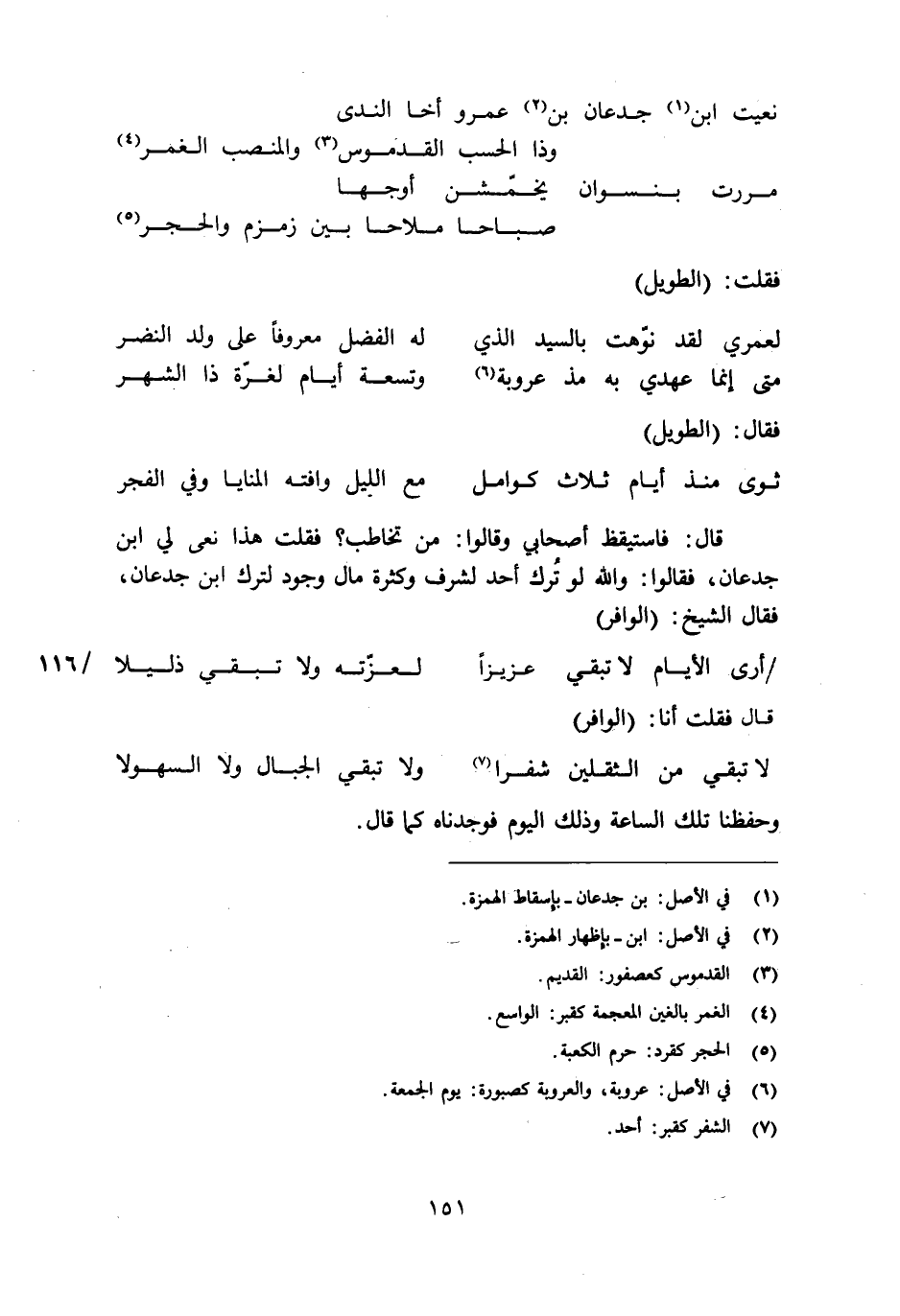 قال: فاستيقظ أصحابي وقالوا: من تخاطب؟ فقلت هذا نعى لي ابن جدعان، فقالوا: والله لو ترك أحد لشرف وكثرة مال وجود لترك ابن جدعان، فقال الشيخ: (الوافر)