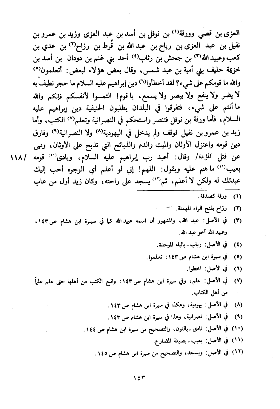العزى بن قصي وورقة [1] بن نوفل بن أسد بن عبد العزى وزيد بن عمرو بن نفيل بن عبد العزى بن رياح بن عبد الله بن قرط بن رزاح [2] بن عدي بن كعب وعبيد الله [3] بن جحش بن رئاب [4] أحد بني غنم بن دودان بن أسد بن خزيمة حليف بني أمية بن عبد شمس، وقال بعض هؤلاء لبعض: أتعلمون [5] والله ما قومكم على شيء؟ لقد أخطئوا [6] دين إبراهيم عليه السلام ما حجر نطيف به لا يضر ولا ينفع ولا يبصر ولا يسمع، يا قوم! التمسوا لأنفسكم فإنكم والله ما أنتم على شيء، فتفرقوا في البلدان يطلبون الحنيفية دين إبراهيم عليه السلام، فأما ورقة بن نوفل فتنصر واستحكم في النصرانية وتعلم [7] الكتب، وأما زيد بن عمرو بن نفيل فوقف ولم يدخل في اليهودية [8] ولا النصرانية [9] وفارق دين قومه واعتزل الأوثان والميت والدم والذبائح التي تذبح على الأوثان، ونهى عن قتل المؤدة/ وقال: أعبد رب إبراهيم عليه السلام، وبادى [10] قومه بعيب [11] ما هم عليه ويقول: اللهم! إني لو أعلم أي الوجوه أحب إليك عبدتك له ولكن لا أعلم، ثم [12] يسجد على راحته، وكان زيد أول من عاب