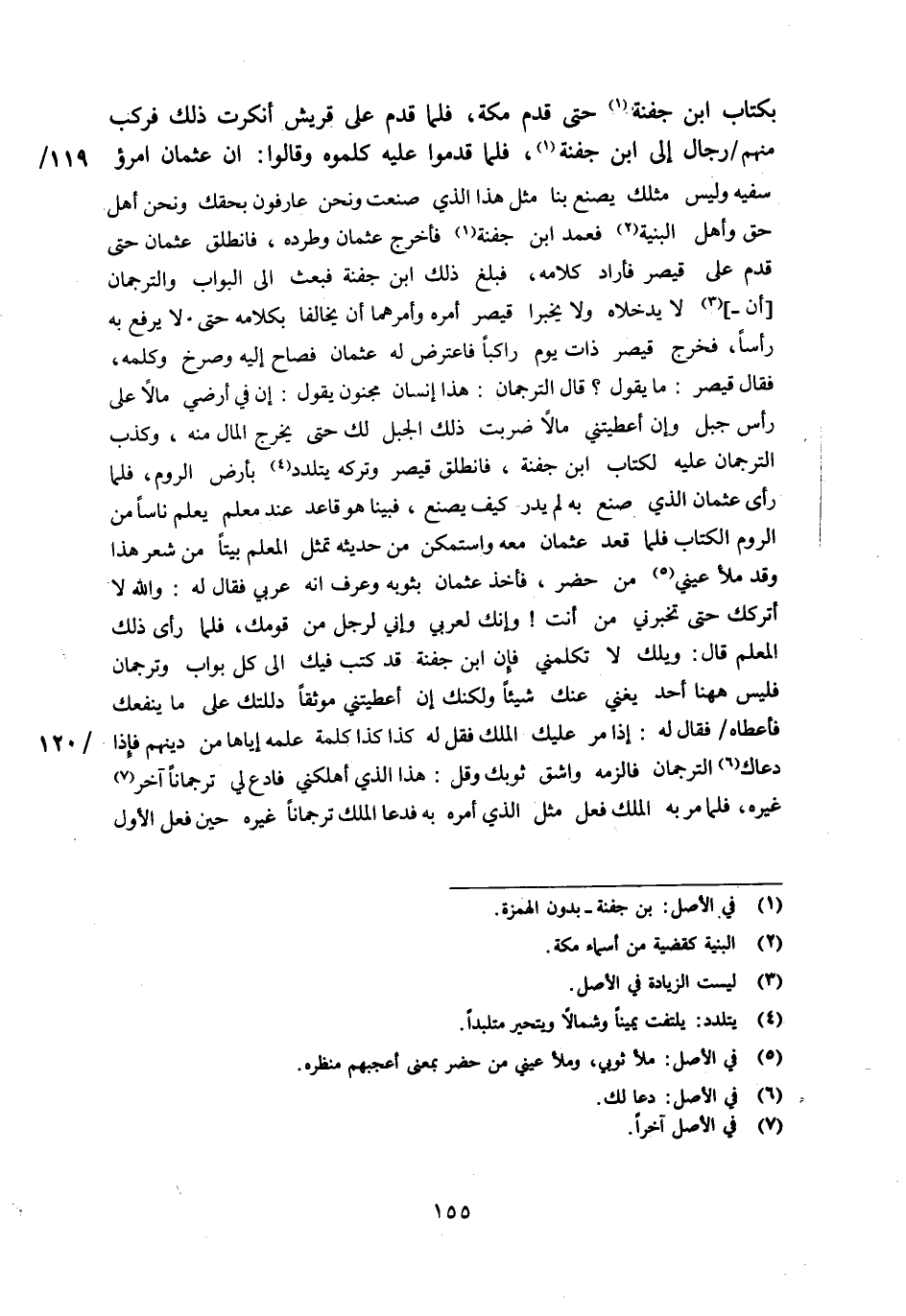 بكتاب ابن جفنة [1] حتى قدم مكة، فلما قدم على قريش أنكرت ذلك فركب منهم/ رجال إلى ابن جفنة [1] ، فلما قدموا عليه كلموه وقالوا: ان عثمان امرؤ سفيه وليس مثلك يصنع بنا مثل هذا الذي صنعت ونحن عارفون بحقك ونحن أهل حق وأهل البنية [2] فعمد ابن جفنة [1] فأخرج عثمان وطرده، فانطلق عثمان حتى قدم على قيصر فأراد كلامه، فبلغ ذلك ابن جفنة فبعث الى البواب والترجمان [أن-] [3] لا يدخلاه ولا يخبرا قيصر أمره وأمرهما أن يخالفا بكلامه حتى لا يرفع به رأسا، فخرج قيصر ذات يوم راكبا فاعترض له عثمان فصاح إليه وصرخ وكلمه، فقال قيصر: ما يقول؟ قال الترجمان: هذا إنسان مجنون يقول: إن في أرضي مالا على رأس جبل وإن أعطيتني مالا ضربت ذلك الجبل لك حتى يخرج المال منه، وكذب الترجمان عليه لكتاب ابن جفنة، فانطلق قيصر وتركه يتلدد [4] بأرض الروم، فلما رأى عثمان الذي صنع به لم يدر كيف يصنع، فبينا هو قاعد عند معلم يعلم ناسا من الروم الكتاب فلما قعد عثمان معه واستمكن من حديثه تمثل المعلم بيتا من شعر هذا وقد ملأ عيني [5] من حضر، فأخذ عثمان بثوبه وعرف انه عربي فقال له: والله لا أتركك حتى تخبرني من أنت! وإنك لعربي وإني لرجل من قومك، فلما رأى ذلك المعلم قال: ويلك لا تكلمني فإن ابن جفنة قد كتب فيك الى كل بواب وترجمان فليس ههنا أحد يغني عنك شيئا ولكنك إن أعطيتني موثقا دللتك على ما ينفعك فأعطاه/ فقال له: إذا مر عليك الملك فقل له كذا كذا كلمة علمه إياها من دينهم فإذا دعاك [6] الترجمان فالزمه وشق ثوبك وقل: هذا الذي أهلكني فادع لي ترجمانا آخر [7] غيره، فلما مر به الملك فعل مثل الذي أمره به فدعا الملك ترجمانا غيره حين فعل الأول