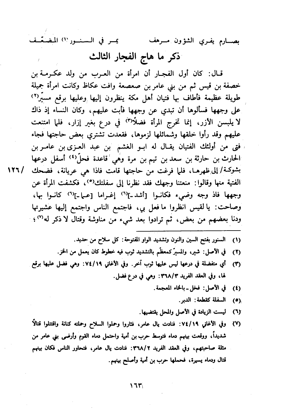 قال: كان أول الفجار أن امرأة من العرب من ولد عكرمة بن خصفة بن قيس ثم من بني عامر بن صعصعة وافت عكاظ وكانت امرأة جميلة طويلة عظيمة فأطاف بها فتيان أهل مكة ينظرون إليها وعليها برقع مسيّر [2] على وجهها فسألوها أن تبدي عن وجهها فأبت عليهم، وكان النساء إذ ذاك لا يلبسن الأزر، إنما تخرج المرأة فضلا [3] في درع بغير إزار، فلما امتنعت عليهم وقد رأوا خلقها وشمائلها لزموها، فقعدت تشتري بعض حاجتها فجاء فتى من أولئك الفتيان يقال له ابو الغشم بن عبد العزى بن عامر بن الحارث بن حارثة بن سعد بن تيم بن مرة وهي قاعدة فحلّ [4] أسفل درعها بشوكة/ إلى ظهرها، فلما فرغت من حاجتها قامت فإذا هي عريانة، فضحك الفتية منها وقالوا: منعتنا وجهك فقد نظرنا إلى سفلتك [5] ، فكشفت المرأة عن وجهها فإذ وجه وضيء فكانوا [أشد-] [6] إغراما [عما-] [6] كانوا بها، وصاحت: يا لقيس انظروا ما فعل بي، فاجتمع الناس واجتمع إليها عشيرتها ودنا بعضهم من بعض، ثم ترادوا بعد شيء من مناوشة وقتال لا ذكر له [7] ،