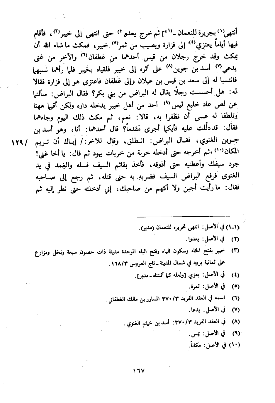 انتهى [1] بجريرة للنعمان-[1]] ثم خرج يعدو [2] حتى انتهى إلى خيبر [3] ، فأقام فيها أياما يعتزي [4] إلى فزارة ويصيب من ثمر [5] خيبر، فمكث ما شاء الله أن يمكث وقد خرج رجلان من قيس أحدهما من غطفان [6] والآخر من غنى يدعي [7] أسد بن جوين [8] على أثره إلى خيبر فلقياه بخيبر فلما رءاهما نسبهما فانتسبا له إلى سعد بن قيس بن عيلان وإلى غطفان فاعتزى هو إلى فزارة فقالا له: هل أحسست رجلا يقال له البراض من بني بكر؟ فقال البراض: سألتما عن لص عاد خليع ليس [9] أحد من أهل خيبر يدخله داره ولكن أقيما ههنا وتلطفا له عسى أن تظفرا به، قالا: نعم، ثم مكث ذلك اليوم وجاءهما فقال: قد دللت عليه فأيكما أجرى مقدما؟ قال أحدهما: أنا، وهو أسد بن جوين الغنوي، فقال البراض: انطلق، وقال للآخر:/ إياك أن تريم المكان [10] ، ثم أخرجه حتى أدخله خربة من خربات يهود ثم قال: يا أخا غنى! جرد سيفك وأعطنيه حتى أذوقه، فأخذ بقائم السيف فسله والغمد في يد الغنوي فرفع البراض السيف فضربه به حتى قتله، ثم رجع إلى صاحبه فقال: ما رأيت أجبن ولا أكهم من صاحبك، إني أدخلته حتى نظر إليه ثم