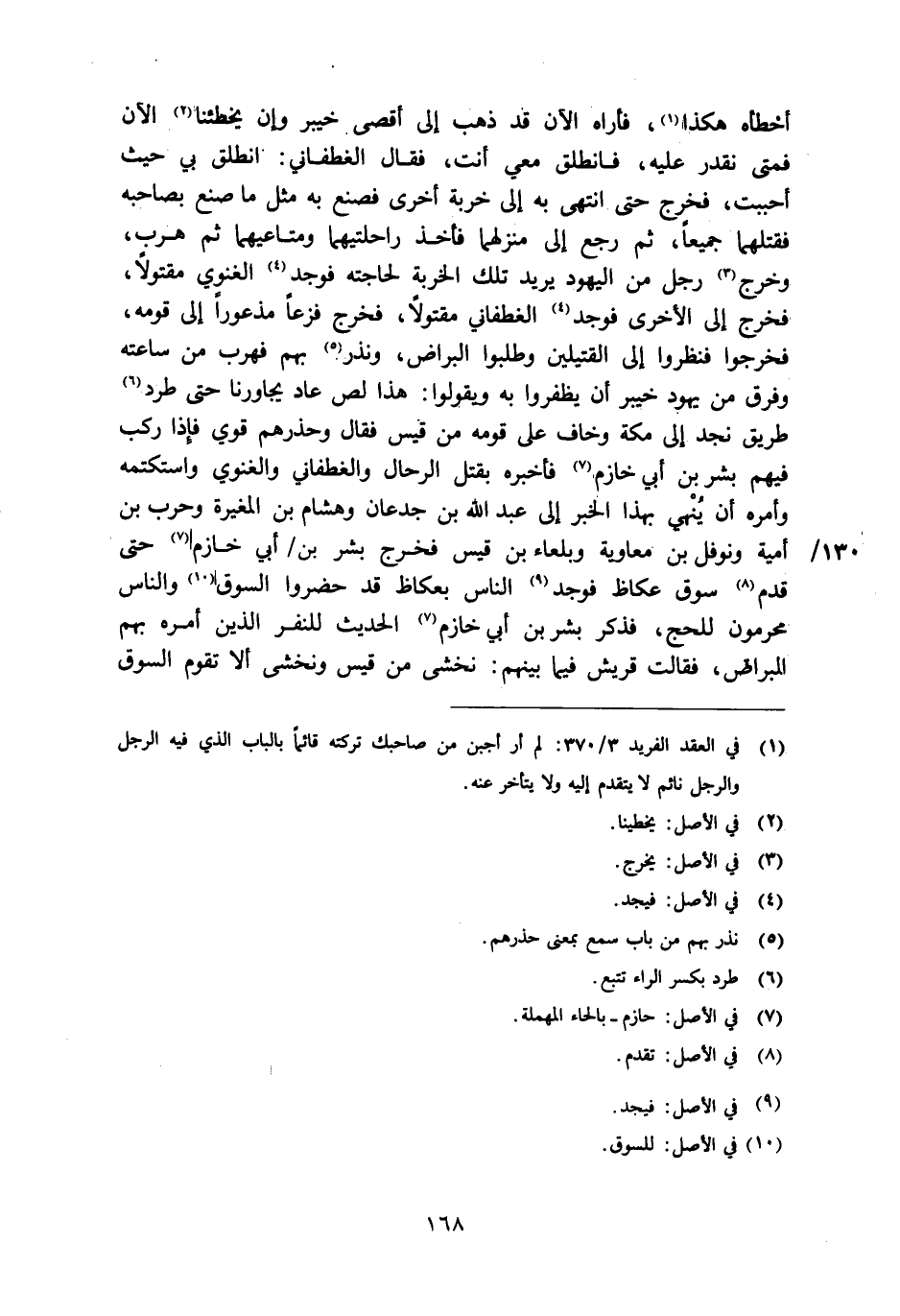 أخطأه هكذا [1] ، فأراه الآن قد ذهب إلى أقصى خيبر وإن يخطئنا [2] الآن فمتى نقدر عليه، فانطلق معي أنت، فقال الغطفاني: انطلق بي حيث أحببت، فخرج حتى انتهى به إلى خربة أخرى فصنع به مثل ما صنع بصاحبه فقتلهما جميعا، ثم رجع إلى منزلهما فأخذ راحلتيهما ومتاعيهما ثم هرب، وخرج [3] رجل من اليهود يريد تلك الخربة لحاجته فوجد [4] الغنوي مقتولا، فخرج إلى الأخرى فوجد [4] الغطفاني مقتولا، فخرج فزعا مذعورا إلى قومه، فخرجوا فنظروا إلى القتيلين وطلبوا البراض، ونذر [5] بهم فهرب من ساعته وفرق من يهود خيبر أن يظفروا به ويقولوا: هذا لص عاد يجاورنا حتى طرد [6] طريق نجد إلى مكة وخاف على قومه من قيس فقال وحذرهم قوي فإذا ركب فيهم بشر بن أبي خازم [7] فأخبره بقتل الرحال والغطفاني والغنوي واستكتمه وأمره أن ينهي بهذا الخبر إلى عبد الله بن جدعان وهشام بن المغيرة وحرب بن أمية ونوفل بن معاوية وبلعاء بن قيس فخرج بشر بن/ أبي خازم [7] حتى قدم [8] سوق عكاظ فوجد [9] الناس بعكاظ قد حضروا السوق [10] والناس محرمون للحج، فذكر بشر بن أبي خازم [7] الحديث للنفر الذين أمره بهم للبراض، فقالت قريش فيما بينهم: نخشى من قيس ونخشى ألا تقوم السوق