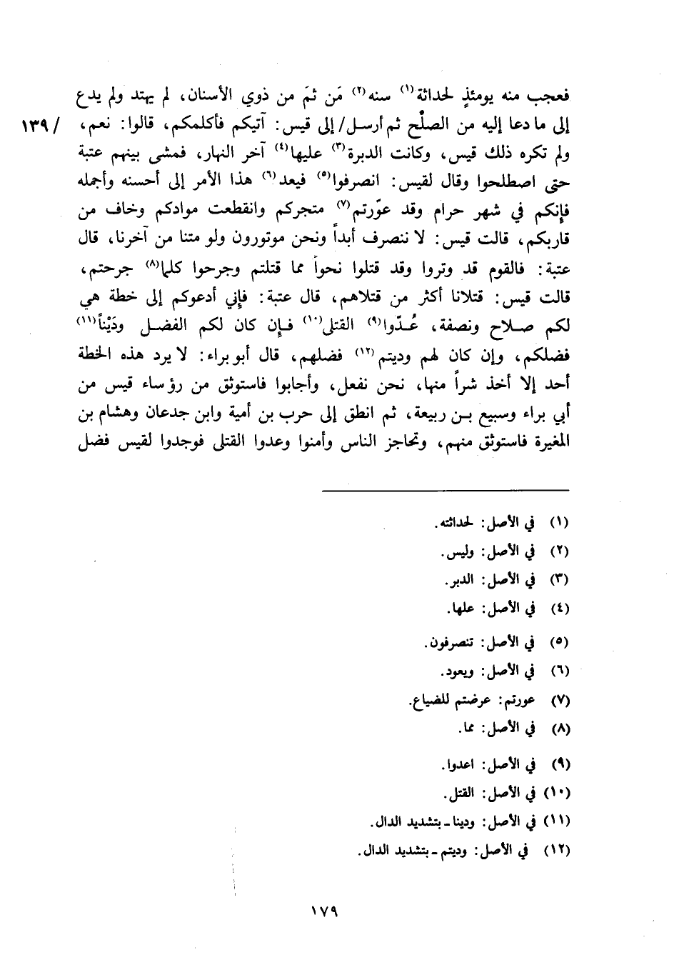 فعجب منه يومئذ لحداثة [1] سنه [2] من ثم من ذوي الأسنان، لم يهتد ولم يدع إلى ما دعا إليه من الصلح ثم أرسل/ إلى قيس: آتيكم فأكلمكم، قالوا: نعم، ولم تكره ذلك قيس، وكانت الدبرة [3] عليها [4] آخر النهار، فمشى بينهم عتبة حتى اصطلحوا وقال لقيس: انصرفوا [5] فيعد [6] هذا الأمر إلى أحسنه وأجمله فإنكم في شهر حرام وقد عوّرتم [7] متجركم وانقطعت موادكم وخاف من قاربكم، قالت قيس: لا ننصرف أبدا ونحن موتورون ولو متنا من آخرنا، قال عتبة: فالقوم قد وتروا وقد قتلوا نحوا مما قتلتم وجرحوا كلما [8] جرحتم، قالت قيس: قتلانا أكثر من قتلاهم، قال عتبة: فإني أدعوكم إلى خطة هي لكم صلاح ونصفة، عدّوا [9] القتلى [10] فإن كان لكم الفضل ودينا [11] فضلكم، وإن كان لهم وديتم [12] فضلهم، قال أبو براء: لا يرد هذه الخطة أحد إلا أخذ شرا منها، نحن نفعل، وأجابوا فاستوثق من رؤساء قيس من أبي براء وسبيع بن ربيعة، ثم انطق إلى حرب بن أمية وابن جدعان وهشام بن المغيرة فاستوثق منهم، وتحاجز الناس وأمنوا وعدوا القتلى فوجدوا لقيس فضل